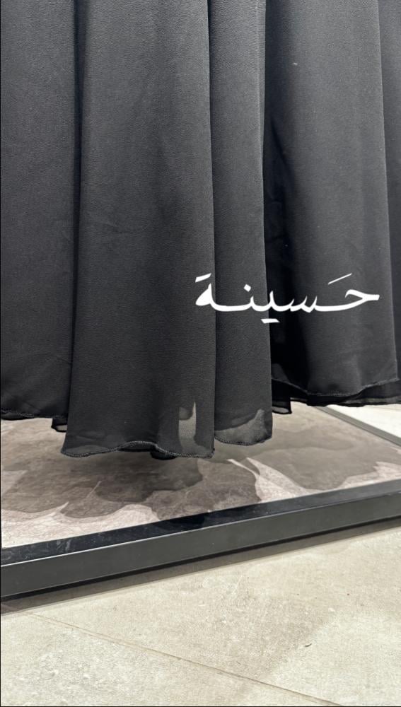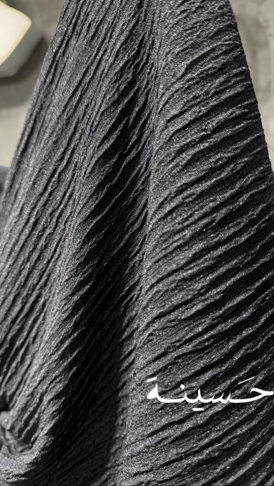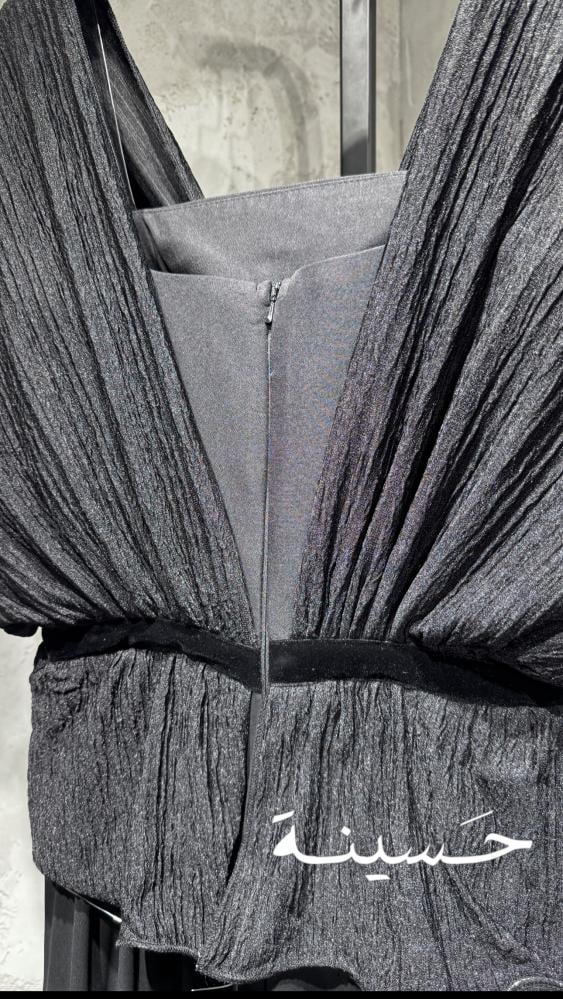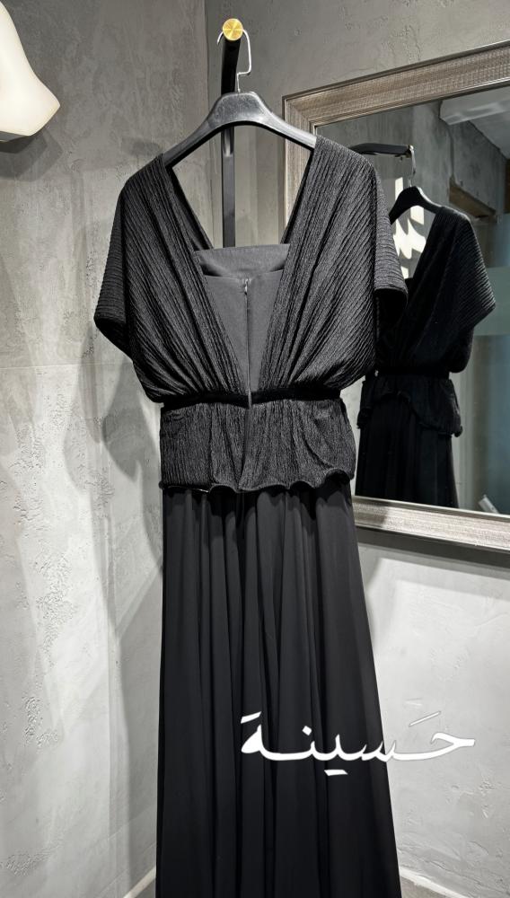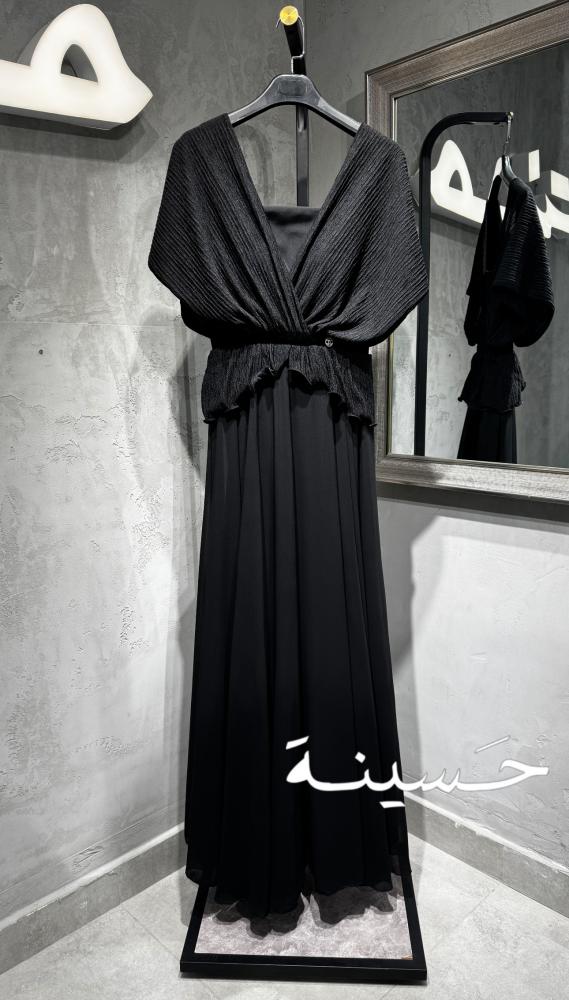 A black evening dress with a simple, elegant, and flowing design. It features a V-shaped wrap bodice with wide, flowing sleeves and a figure-defining gathered waist. The skirt is made of a light, wide fabric that provides elegant movement, combining simplicity and luxury.