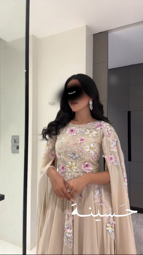 فستان فخم بلون بيج هادئ، مصنوع من شيفون انسيابي مطرّز بالكامل بتطريزات زهرية بارزة بألوان ناعمة مثل البنفسجي والزهري والسكري. يميز التصميم لمسة ملكية في الأكمام المنسدلة، وتفاصيل دقيقة عند الخصر تبرز أنوثة القَصّة. مثالي للمناسبات الراقية ويجمع بين الرقة والفخامة