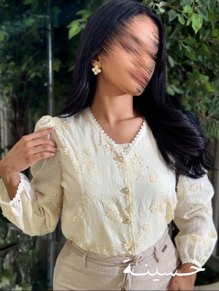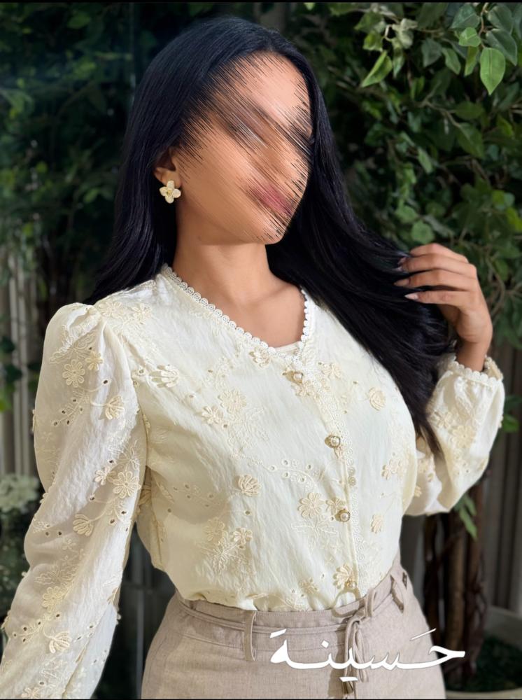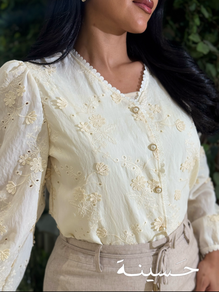 بلوزة عاجية ناعمة، بتطريز ورود ناعم متوزع بانسيابية على القماش، وياقة دائرية مخرّمة تضيف لمسة أنثوية. الأزرار الصغيرة الأمامية تكمل تفاصيل التصميم بجاذبية ناعمة، والأكمام المنفوخة تعطي توازن مثالي بين الكلاسيكية والستايل العصري