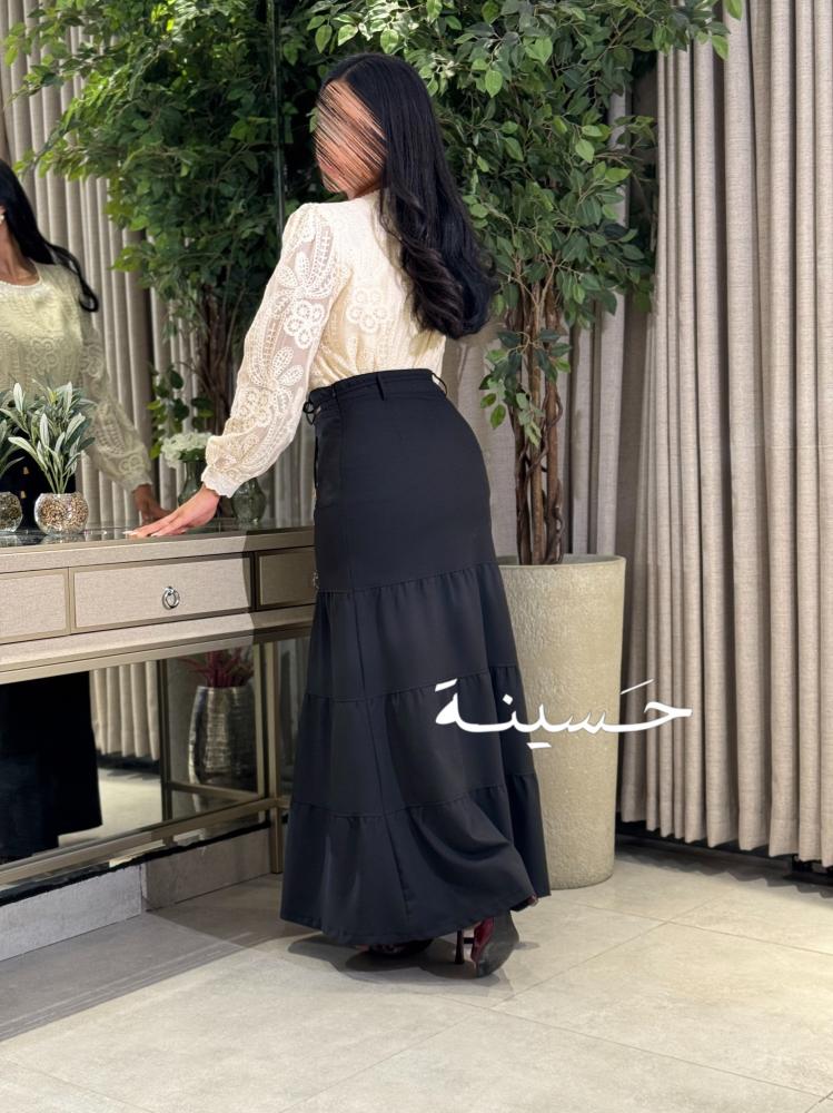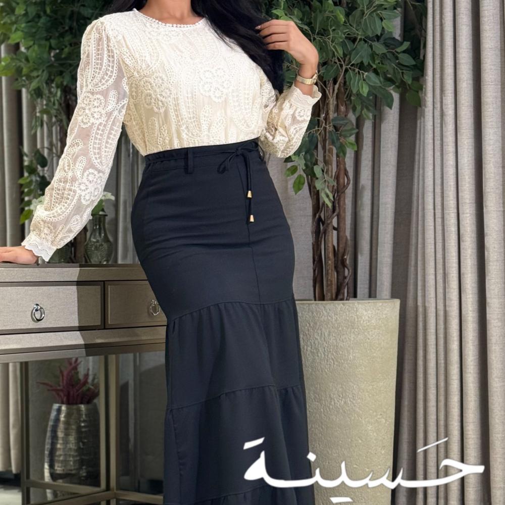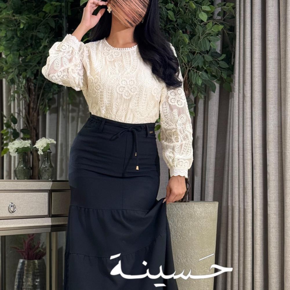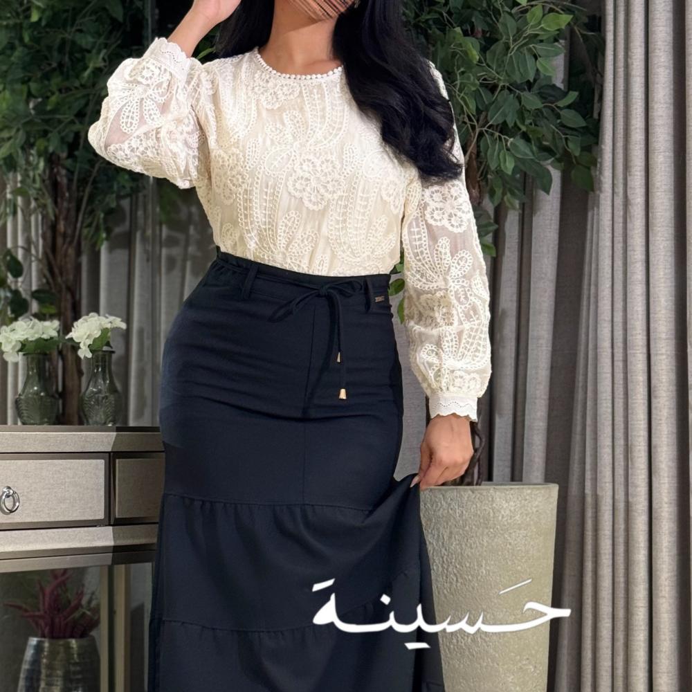 This off-white lace blouse features exquisite floral embroidery covering the entire design. The round neck is embellished with tiny pearls for a classic, feminine touch, and its long, sheer sleeves feature elegantly patterned edges.
