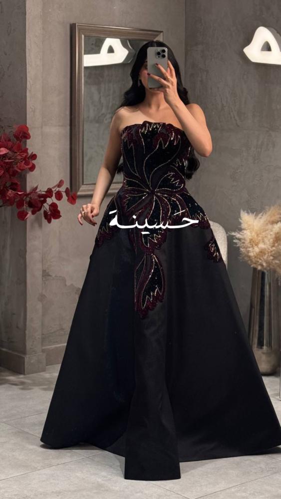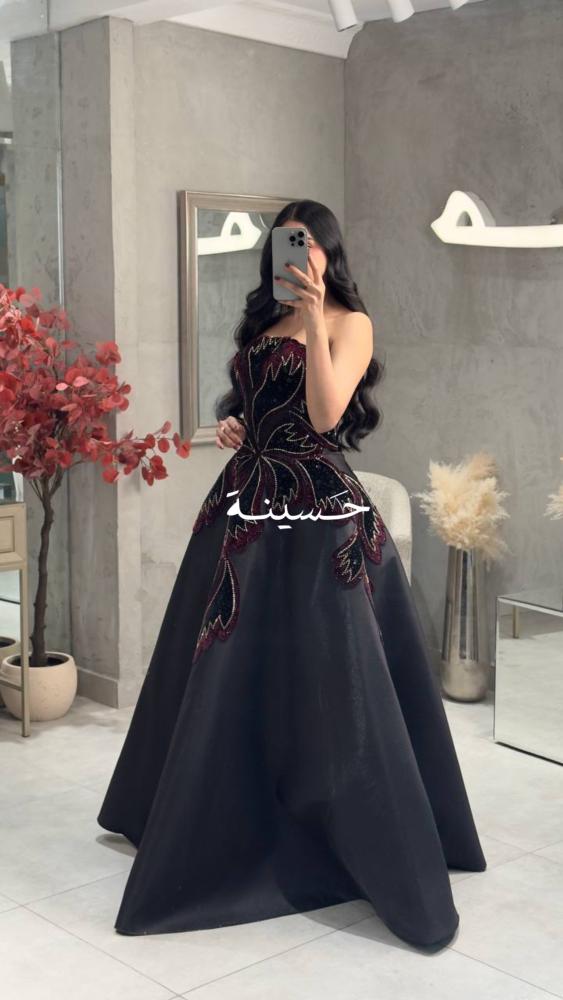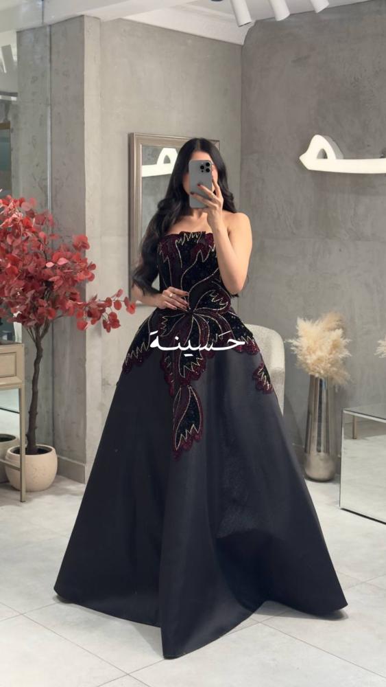 فستان أسود فخم بقصّة A-line، مصنوع من قماش تفت سميك، بدون أكمام وبياقة صدر مستقيمة. يتميّز بتطريز بارز بشكل زهرة كبيرة بلون عنابي لامع يزيّن الجزء الأمامي، ويمنحه طابعاً فنياً أنيقاً. مثالي للمناسبات الرسمية والظهور المميز
