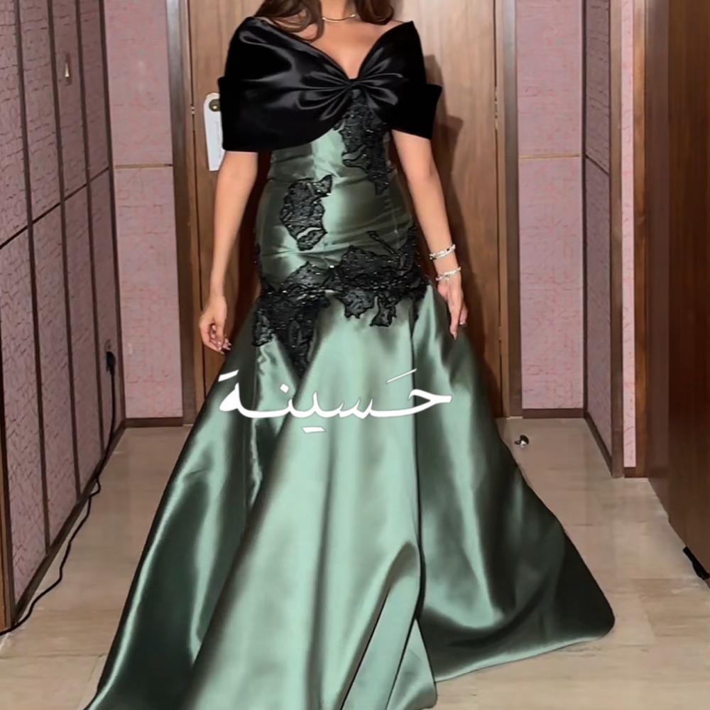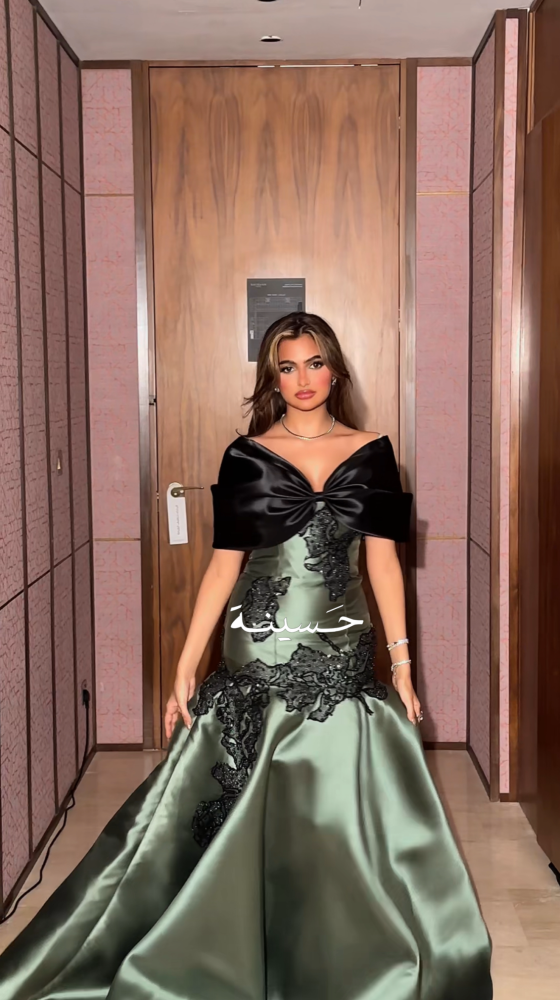 فستان رسمي بلون زمردي وتفاصيل سوداءفستان سهرة بلون زيتي فاخر بقصّة A-line، مصنوع من ساتان لامع ينسدل بأناقة. يتميّز بتطريز أسود فاخر على الخصر والصدر، وتفصيلة عقدة كبيرة عند الياقة تضيف لمسة درامية فخمة. تصميم راقٍ ومميز للمناسبات الرسمية