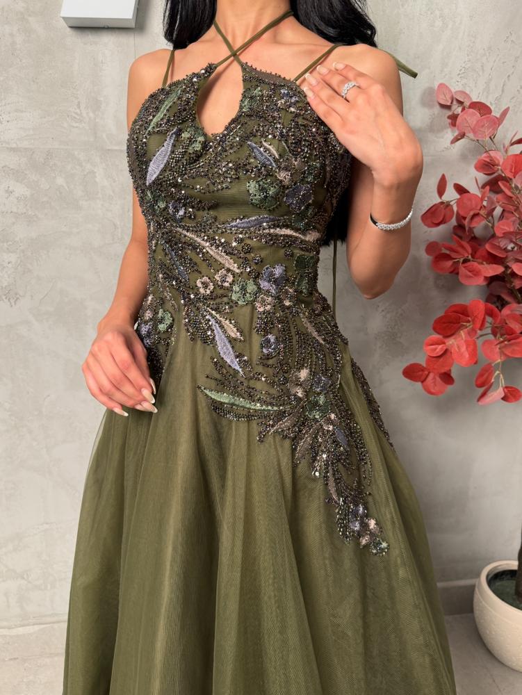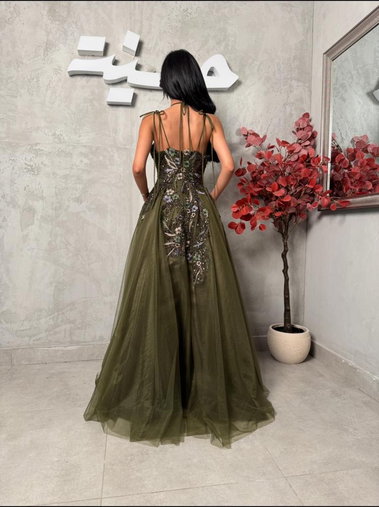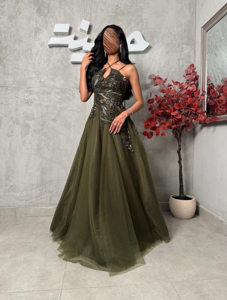فستان زيتي بتصميم أميري فاخر، مصنوع من تول منسدل وتنورة واسعة بطابع ناعم. يتميّز بجزء علوي مطرّز بالخرز والترتر، مع حمالات رفيعة متقاطعة تضيف لمسة عصرية جريئة. مثالي للسهرات والإطلالات المميزة.