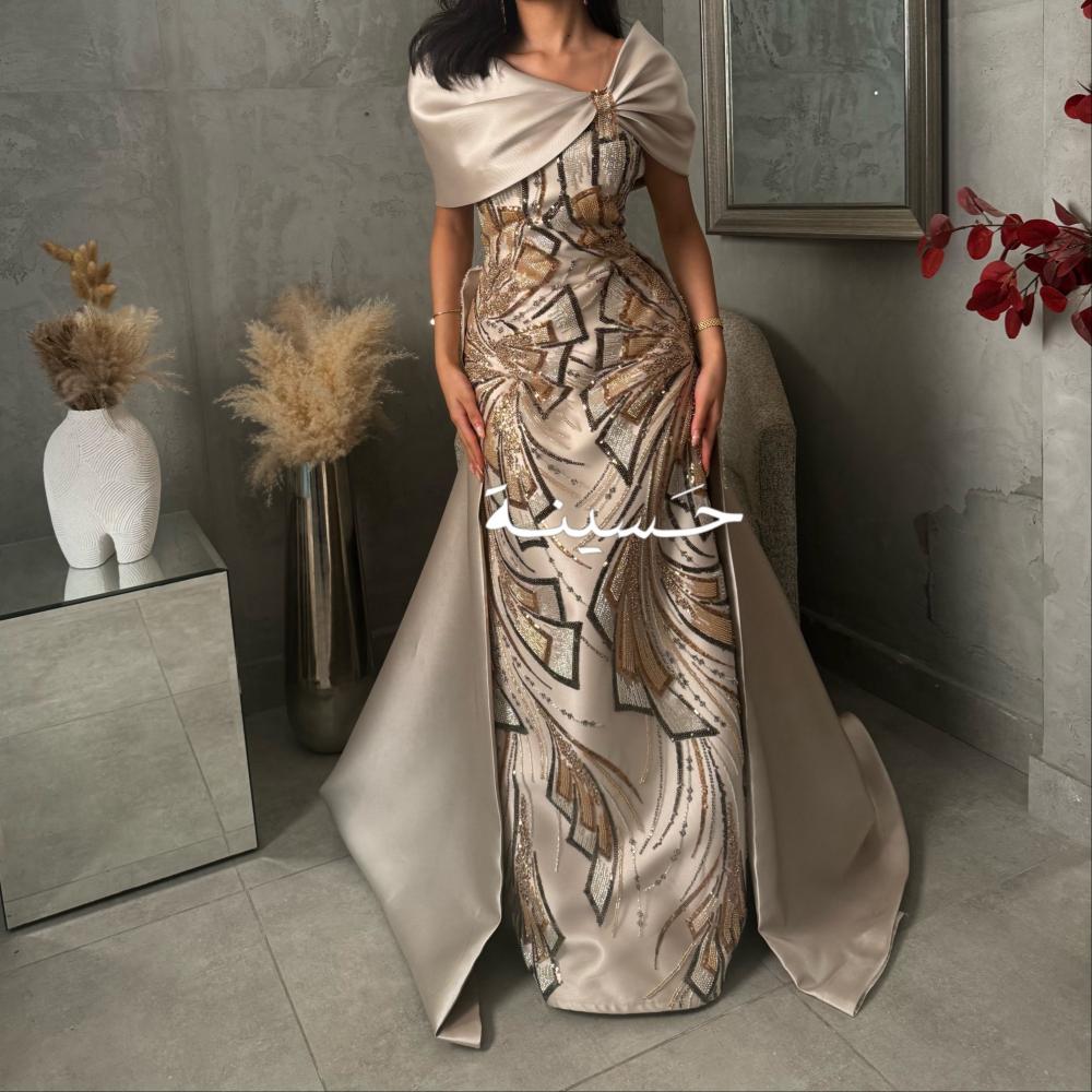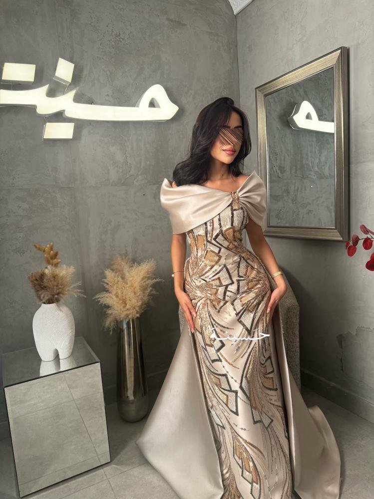 فستان بيج مطرّز بكتف فيونكةفستان بيج لامع بتطريز هندسي ذهبي وكاب جانبي فخم، تصميم معماري فاخر يبرز الهيبة والأنوثة بلمسة فنية
