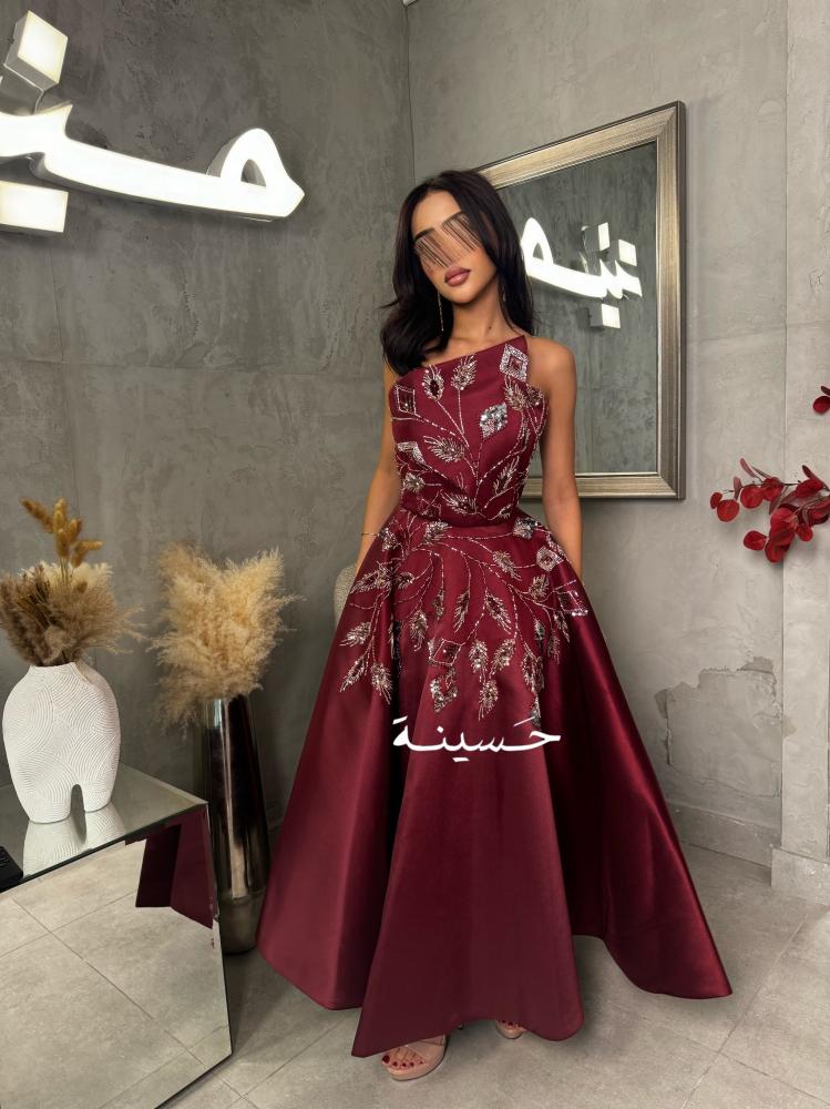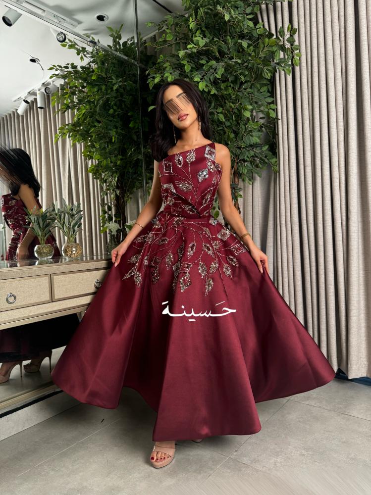 فستان نقشة الخريف الملكي بدون أكمامفستان عنابي منفوش بتطريز فخم على شكل أوراق لامعة، قصة راقية تبرز الخصر وتزيد الهيبة.