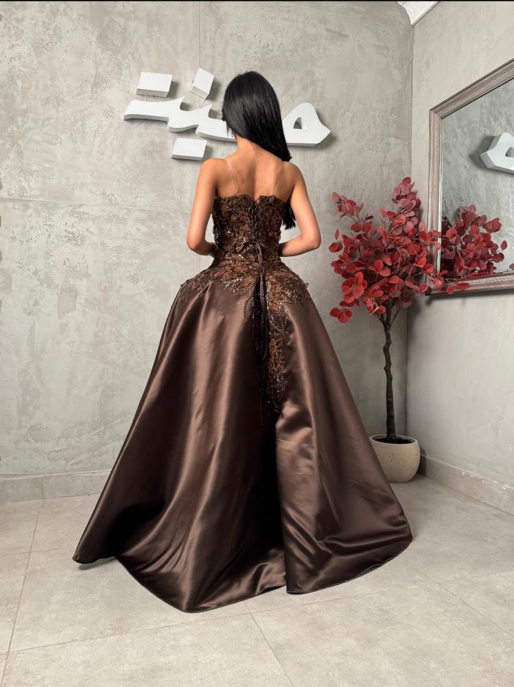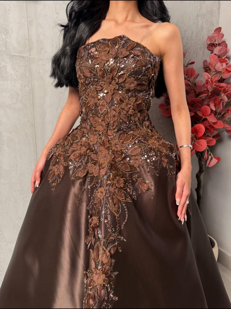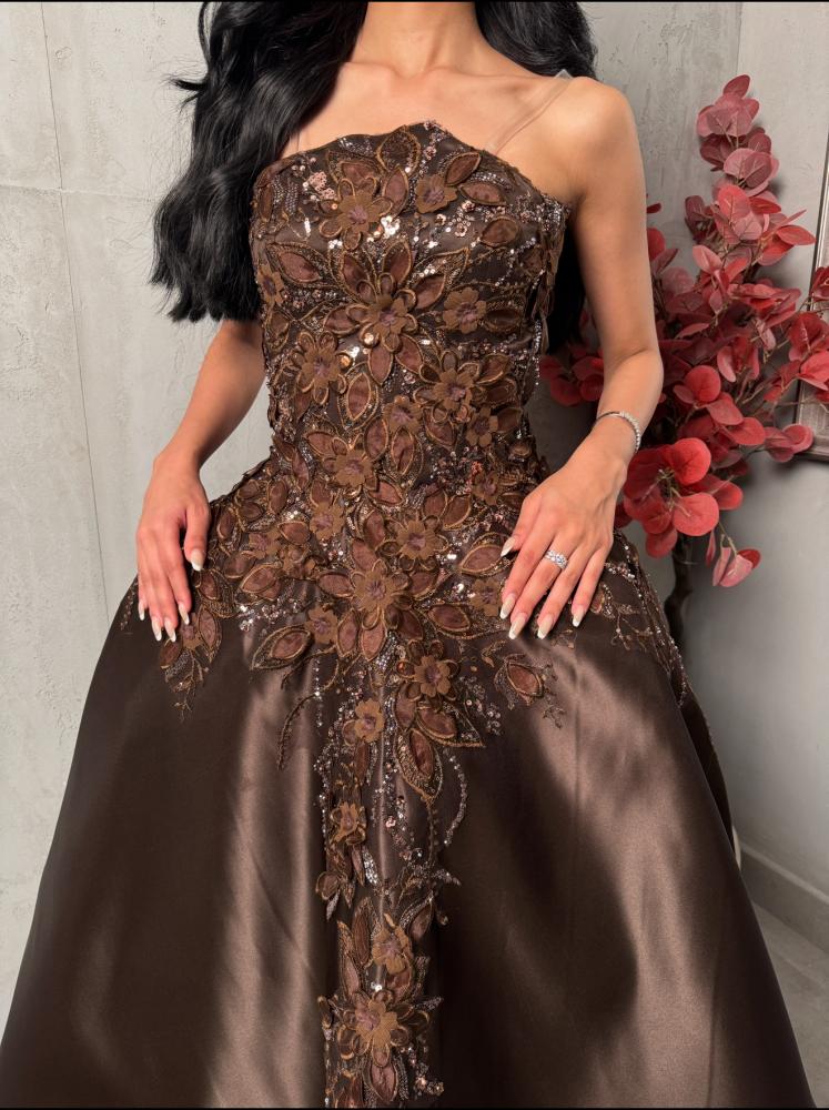 دلّلي نفسك بفستان السهرة البني اللي يجمع بين الفخامة والبساطة. تصميمه بدون حمالات يبرز جمالك وأنوثتك، والتطريز الدقيق يضفي عليه لمسة ملكية.