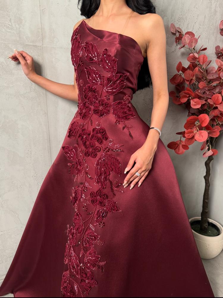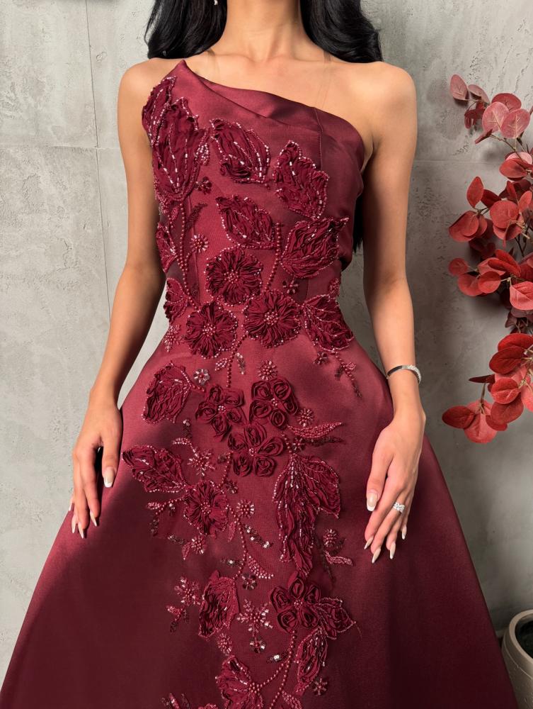 فستان نتفه ورود برغنديفستان عنّابي ملكي بدون أكمام، مصنوع من قماش تفت فاخر بقصّة A-line واسعة. يتميّز بتطريز زهري بارز من الخرز والترتر يزيّن الجزء الأمامي بالكامل، ليمنح الفستان لمسة فخمة ومهيبة. مثالي للمناسبات الفاخرة والظهور الراقي