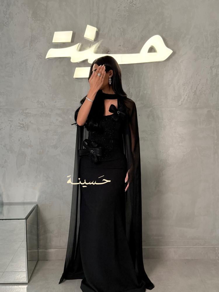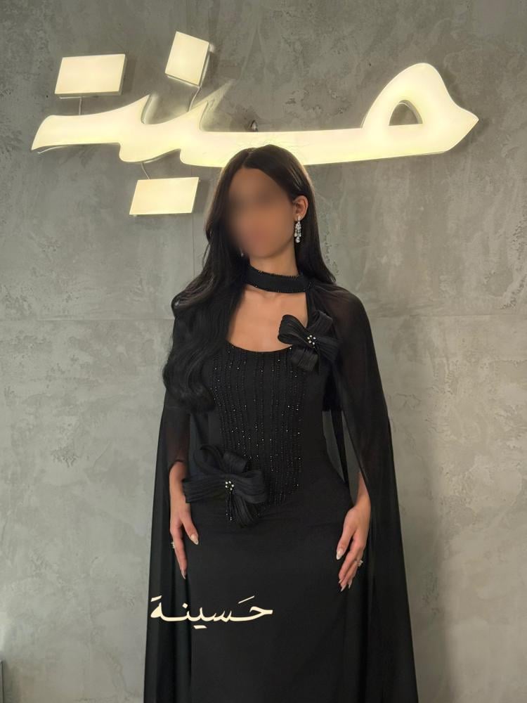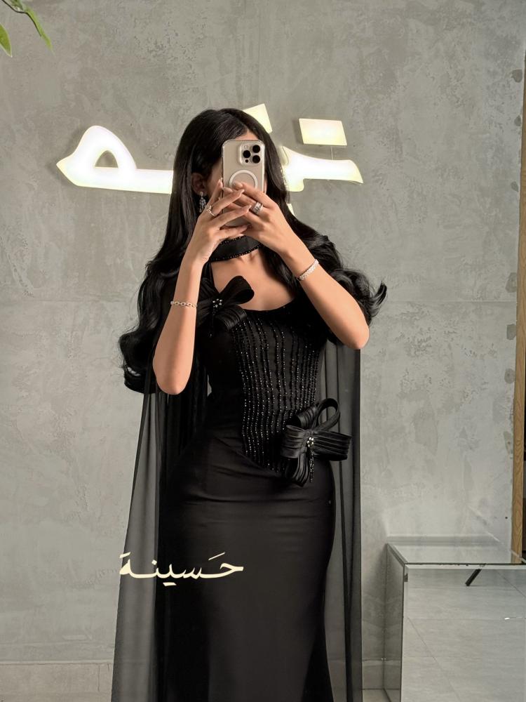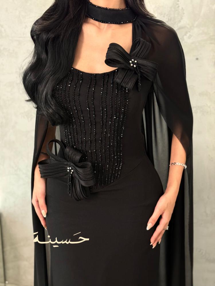 فستان أسود فاخر يجمع بين الرقي الكلاسيكي والابتكار العصري بتفاصيله الدقيقة وحضوره المهيب.
