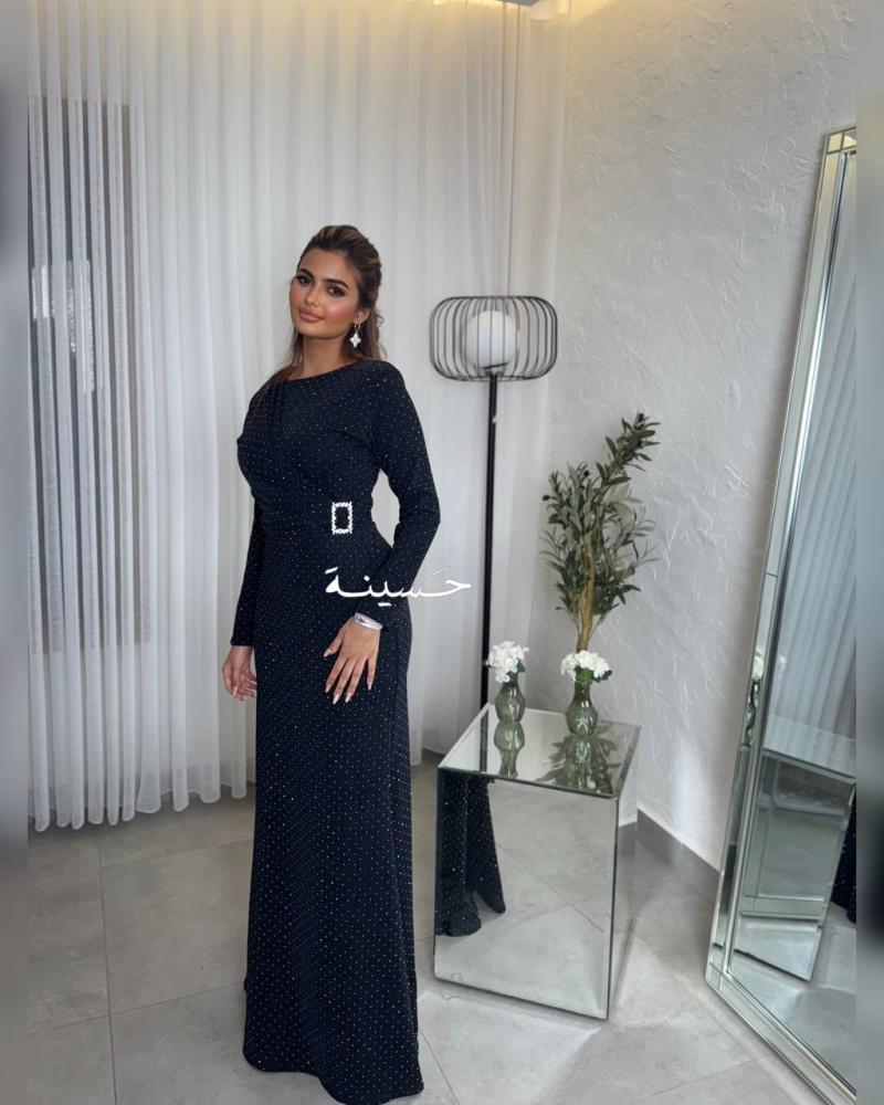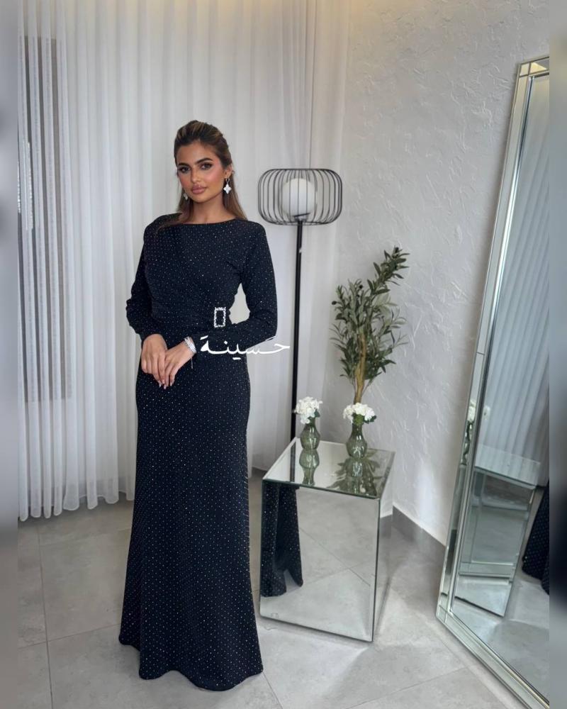فستان أنيق بطابع كلاسيكي وراقي، يتميز بقصة ضيقة من الأعلى تنسدل تدريجياً لتمنح قواماً انسيابياً ومتوازن. مزين بنقش نقطي بسيط يضفي لمسة من اللمعان الناعم، مع حزام بنفس الخامة مزود بإبزيم أنيق يحدد الخصر ويبرز القوام. الأكمام الطويلة والتصميم المحتشم يجعلانه خياراً مثالياً للمناسبات الراقية.