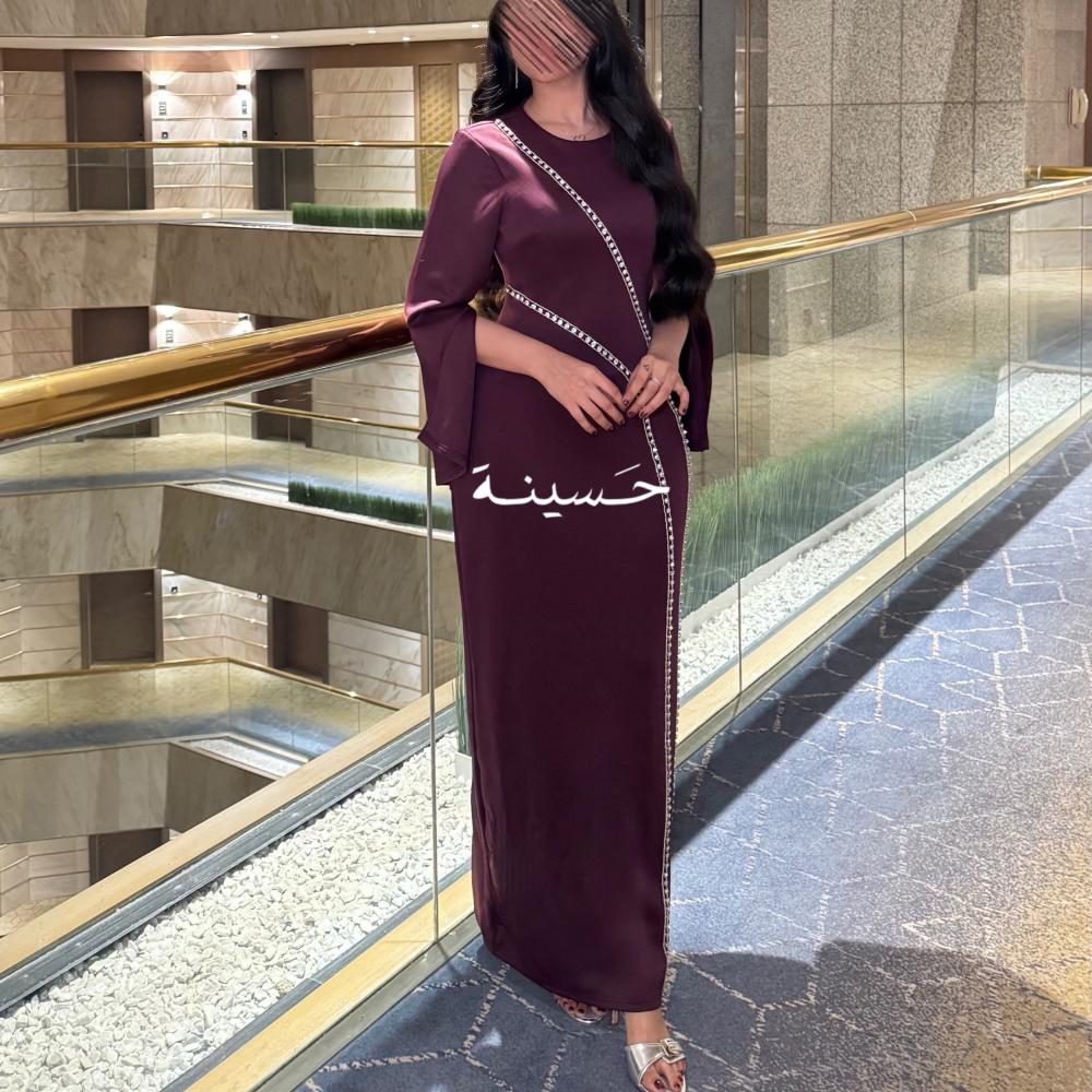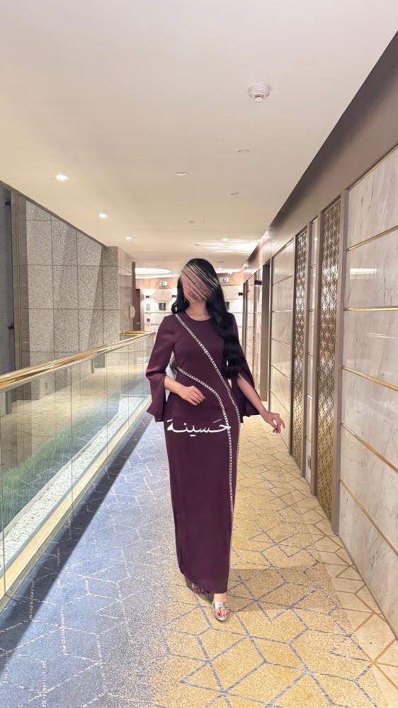 فستان موف أكمام طويله ماسك بخطين لولوفستان خمري ناعم بخامة مطاطية انسيابية، مزين بخطين مائلين من الكريستال اللامع تعطي تحديد جذاب للجسم. الأكمام بتصميم واسع من الكتف تضيف حركة وأناقة. مثالي للطلّات الرسمية والمناسبات الراقية المحتشمة.