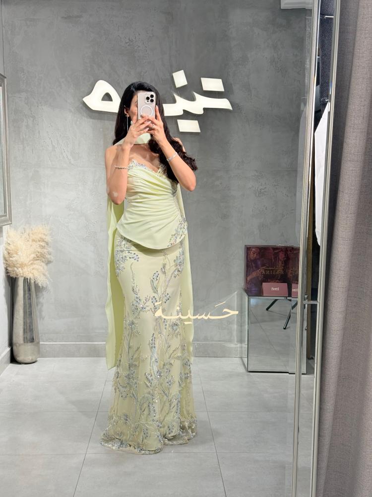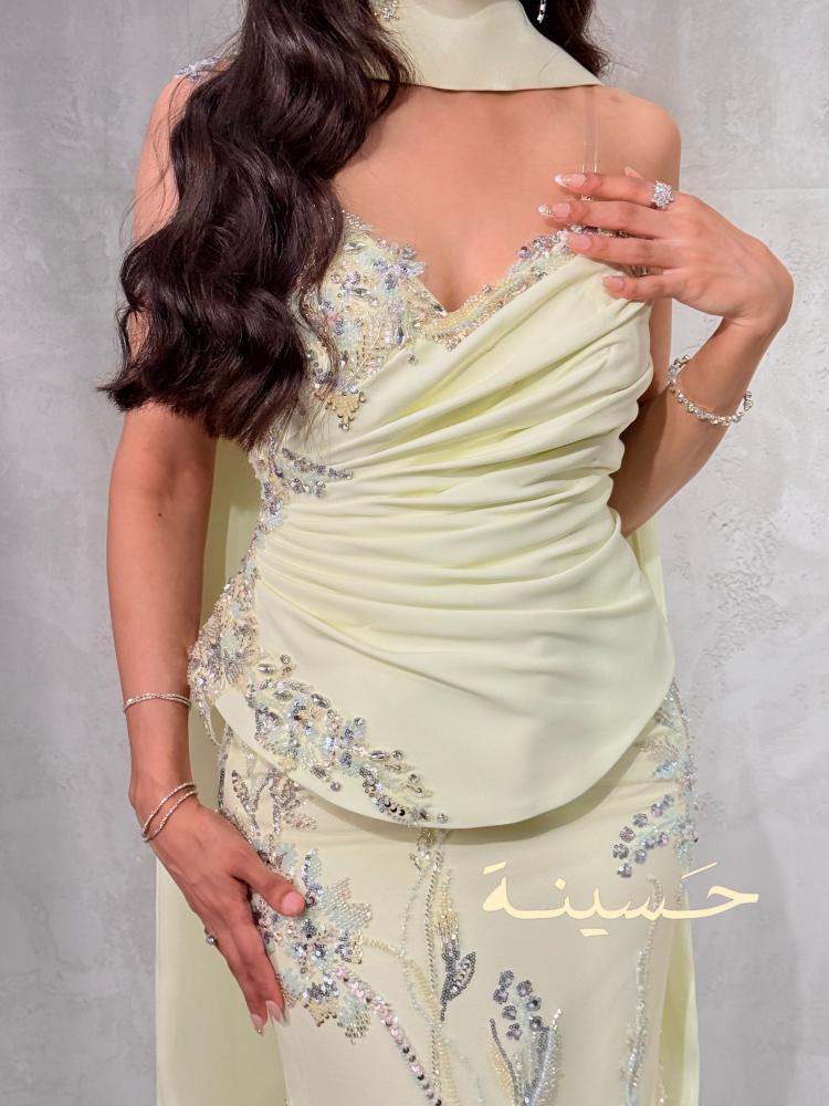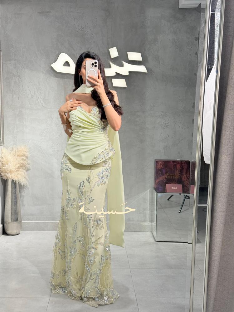 فستان سهرة فاخر بلون باستيل ناعم يفيض أنوثة ورُقياً، يتميّز بقصّة درابيه جذابة عند الصدر تنساب بانسيابية على القوام وتمنح الإطلالة لمسة رومانسية ساحرة.