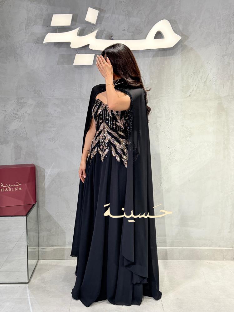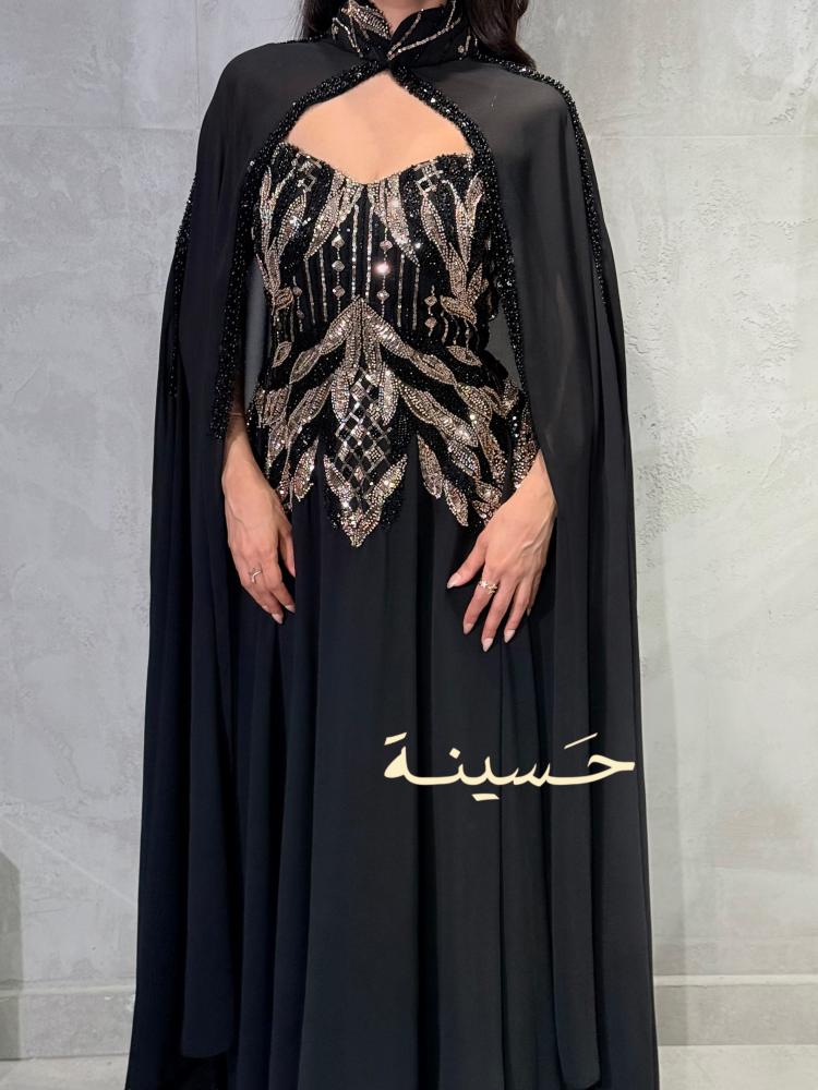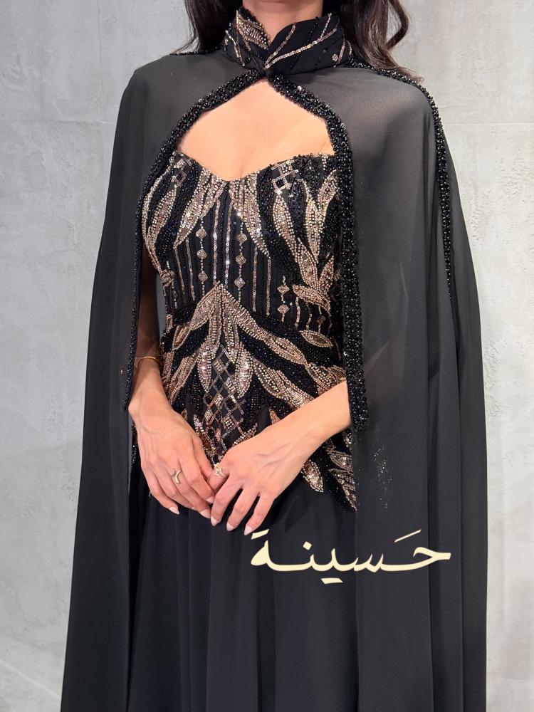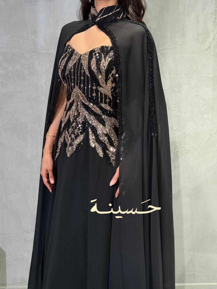 فستان سهرة أسود فاخر يجمع بين الأناقة والفخامة، يتميز بكورسيه مطرز يدوياً بتفاصيل براقة ذهبية ولمسات كريستالية لامعة تضفي بعداً فنياً ساحراً. يكتمل التصميم بكاب شيفون طويل منسدل مزين بحواف مطرزة بالخرز اللامع مع ياقة عالية أنيقة، ليمنح إطلالة ملكية مهيبة مثالية للمناسبات الراقية والسهرات المميزة