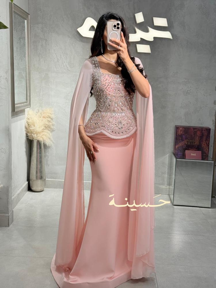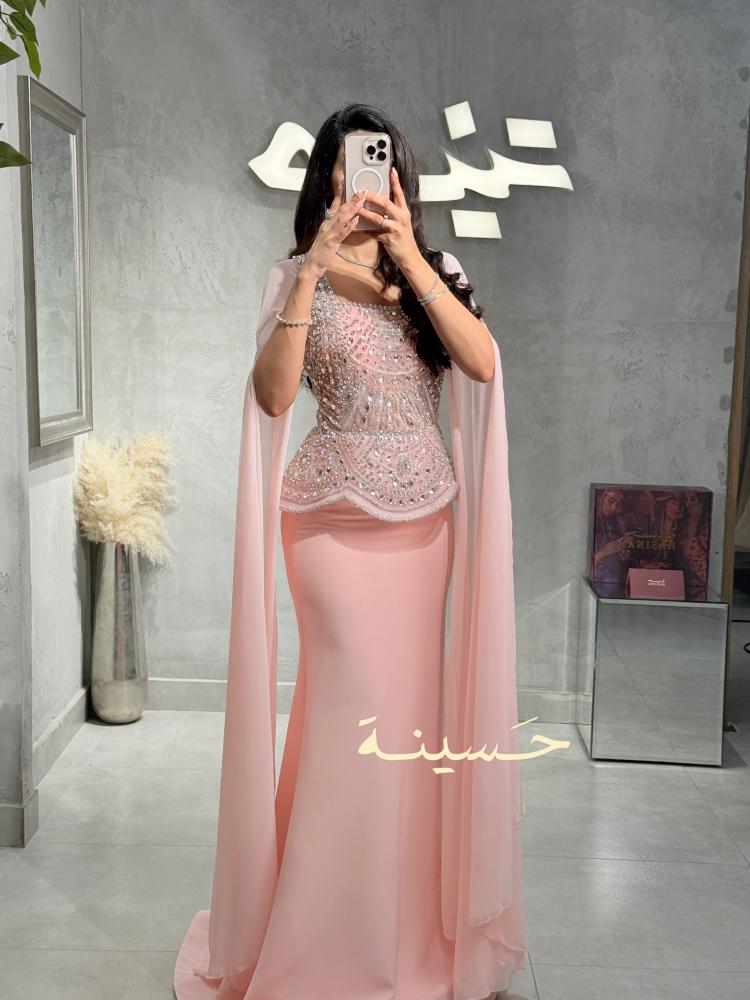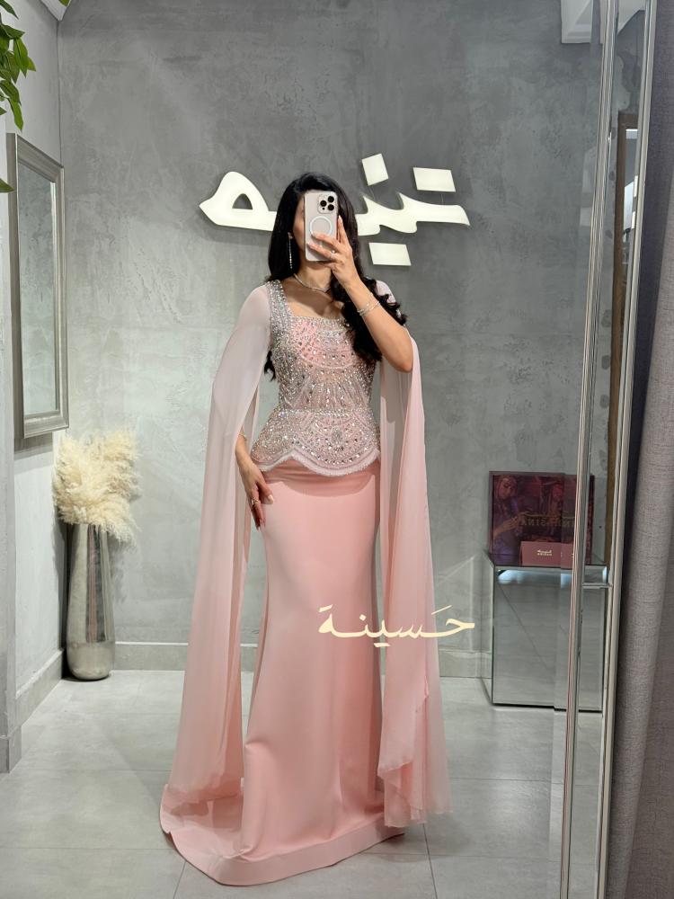 فستان سهرة فخم بلون وردي ناعم يفيض أنوثة وأناقة، يتميّز بصدريّة غنية مطرّزة بالكامل بالكريستالات والأحجار اللامعة بتصميم هندسي فاخر يعكس الضوء بأسلوب ساحر.