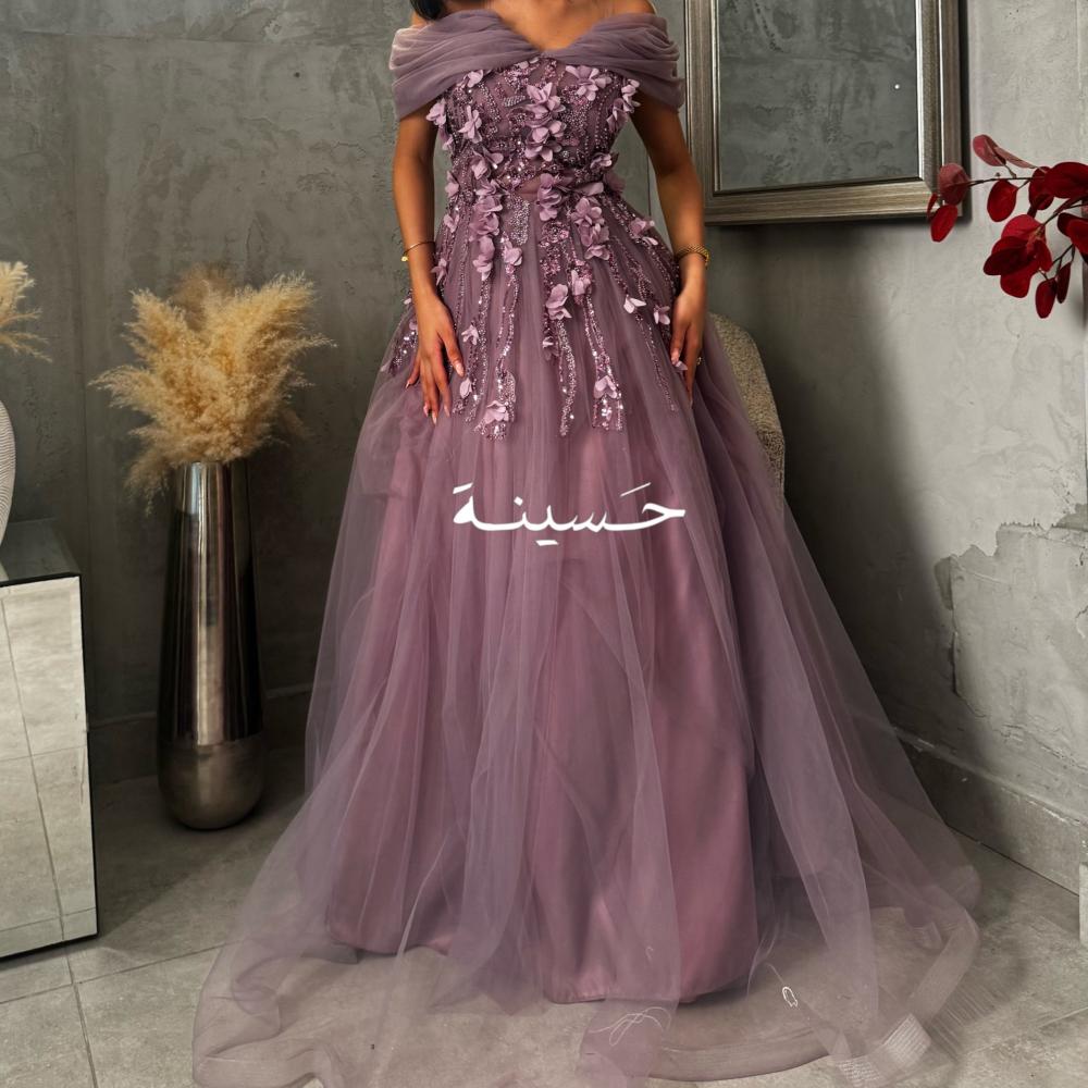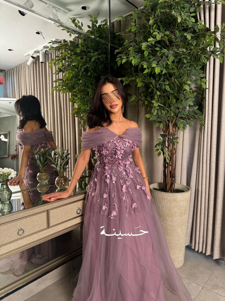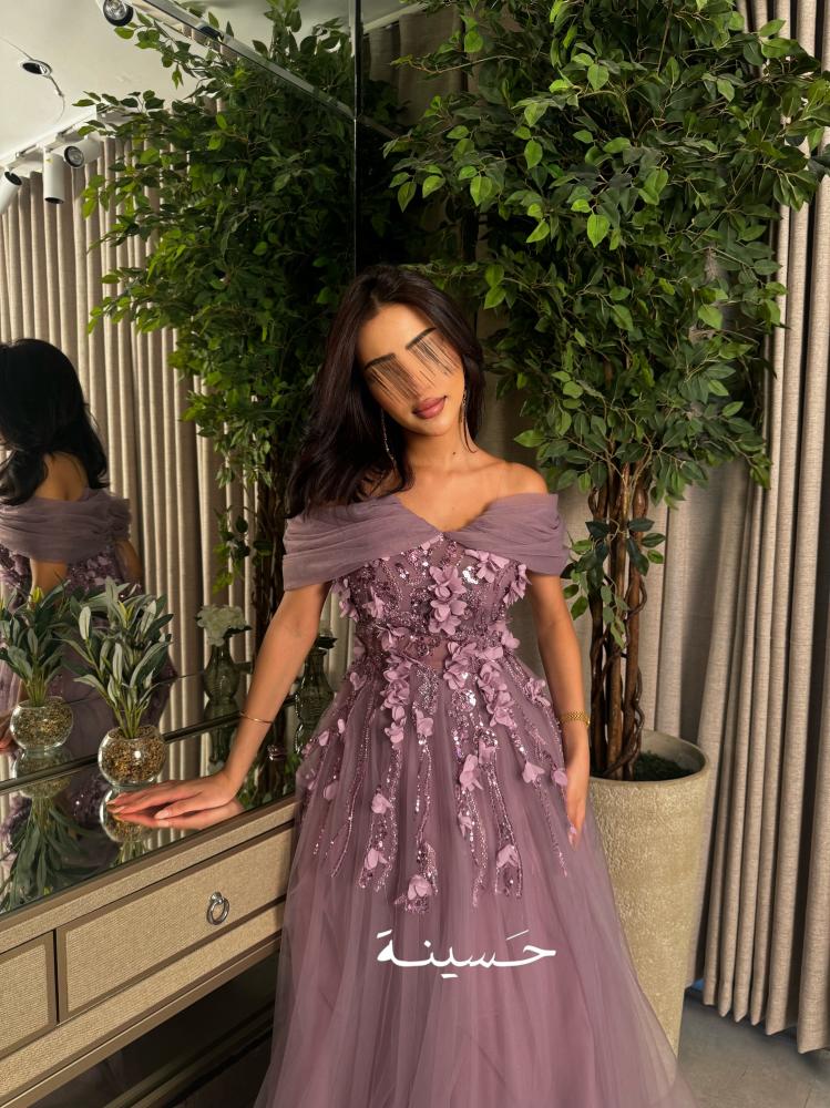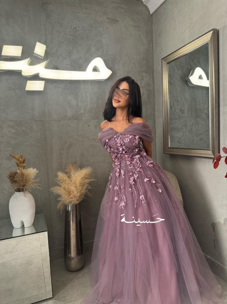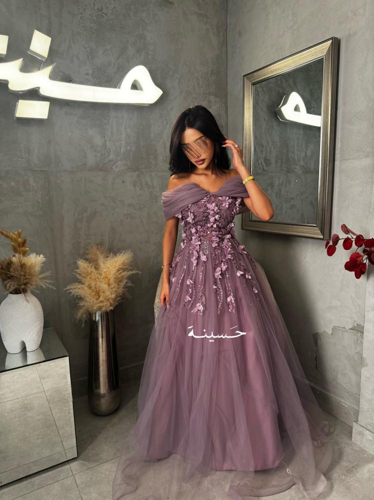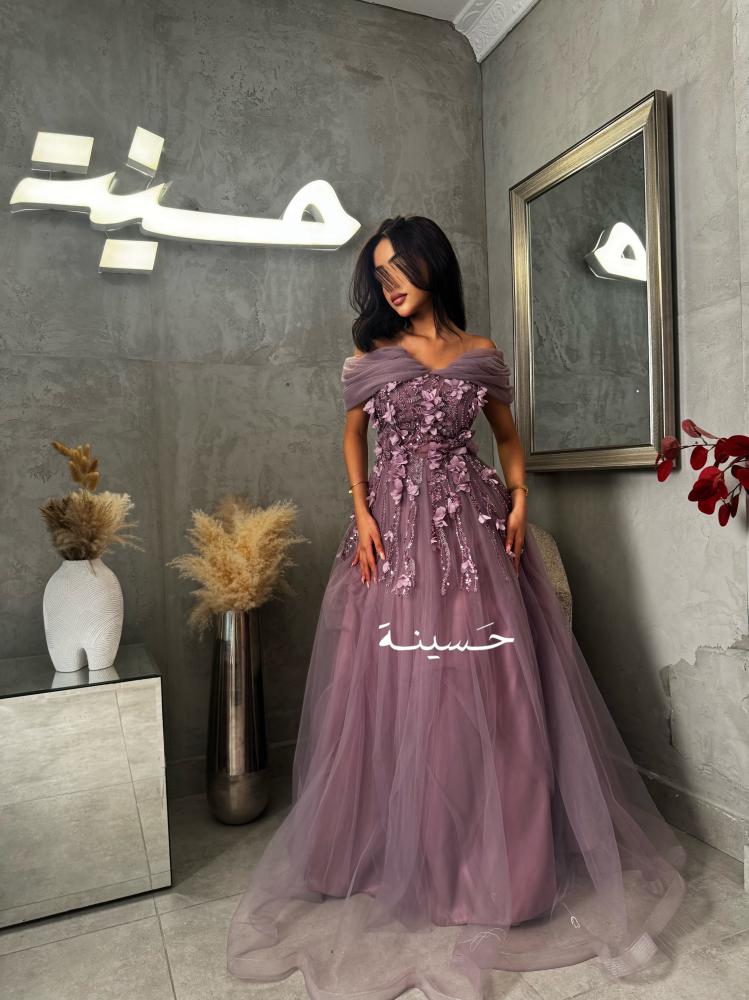 فستان تول بنفسجي بتطريز زهري ناعمفستان تول بنفسجي ناعم بتطريز وردي فخم، بقصة حالمة تنساب كأنها نسمة على جسد ملكة رومانسية.