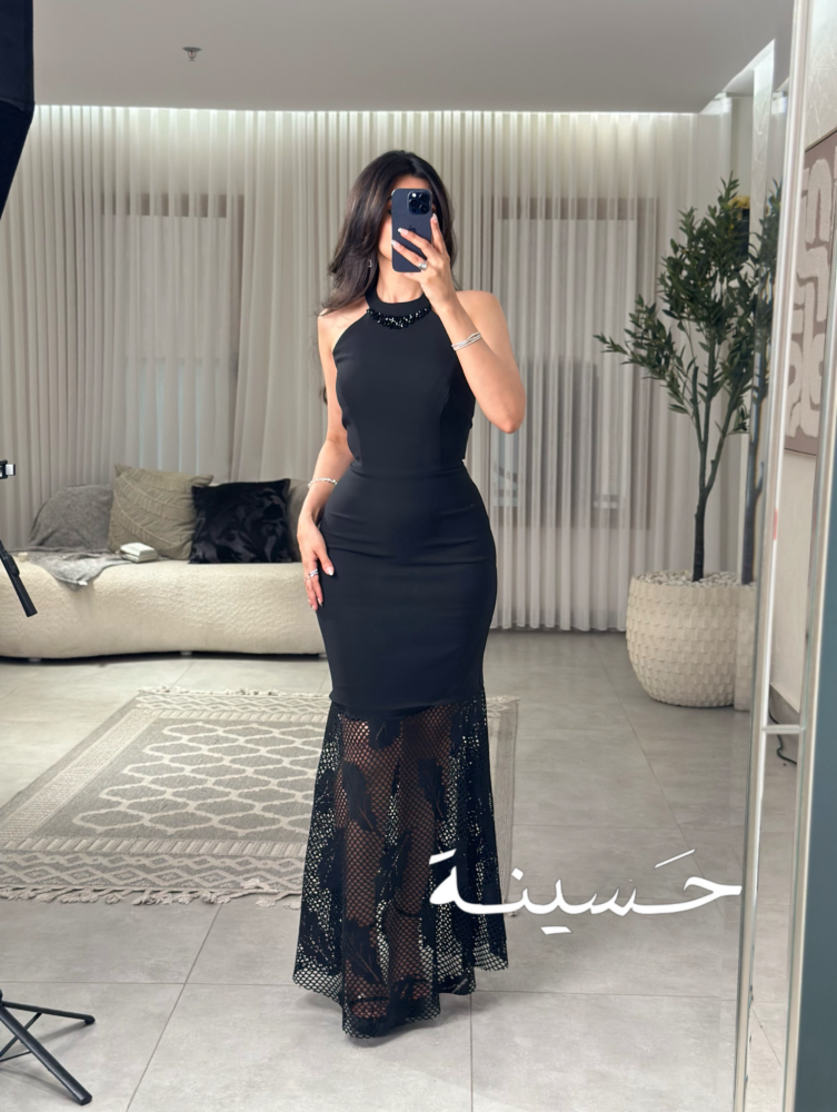 فستان أسود أنيق بدون أكمام، تصميم ضيق يبرز القوام مع ياقة مطرزة خرز أسود لامع، وتنورة تنسدل بطبقة شبكية طويلة تعطي لمسة جريئة وعصرية