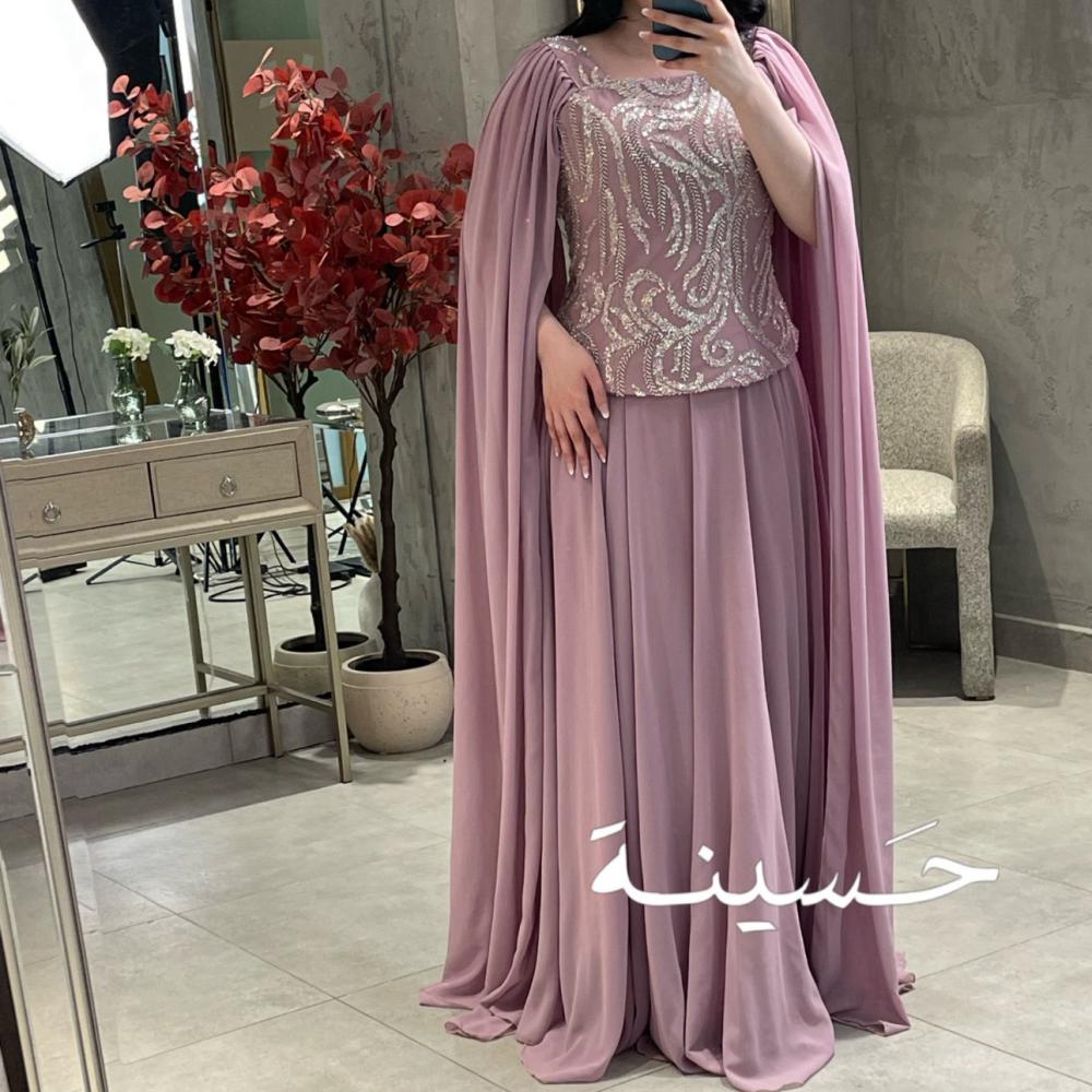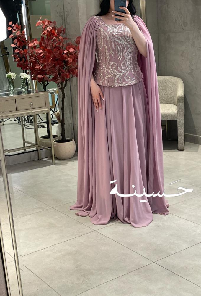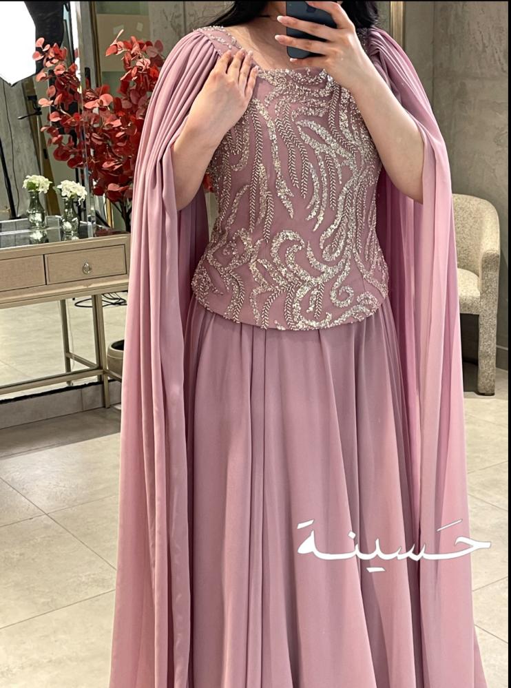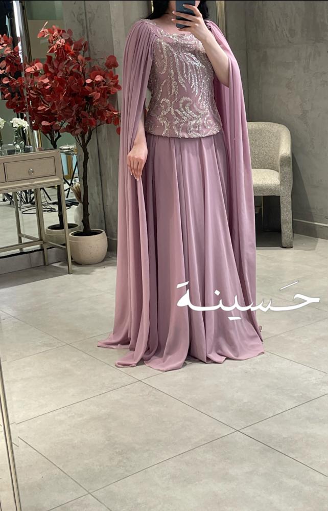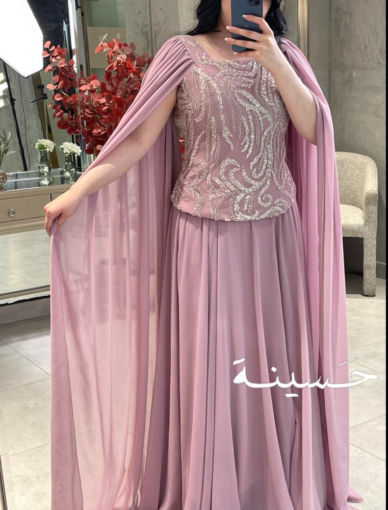 فستان سهرة بلون وردي من شيفون انسيابي، مزين بتطريزات فضية لامعة على الصدر، مع كاب طويل منسدل من الأكتاف يمنح إطلالة راقية وناعمة