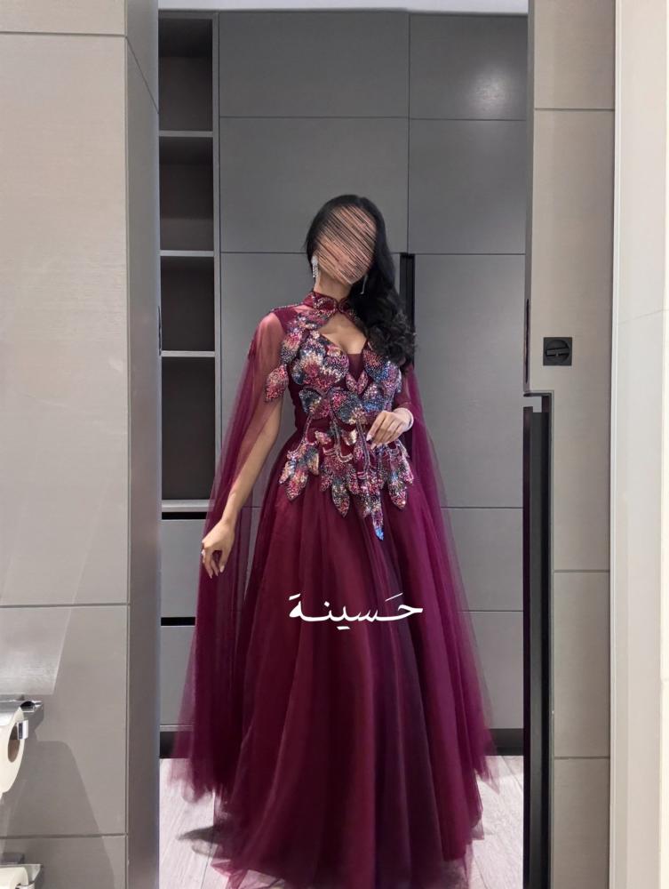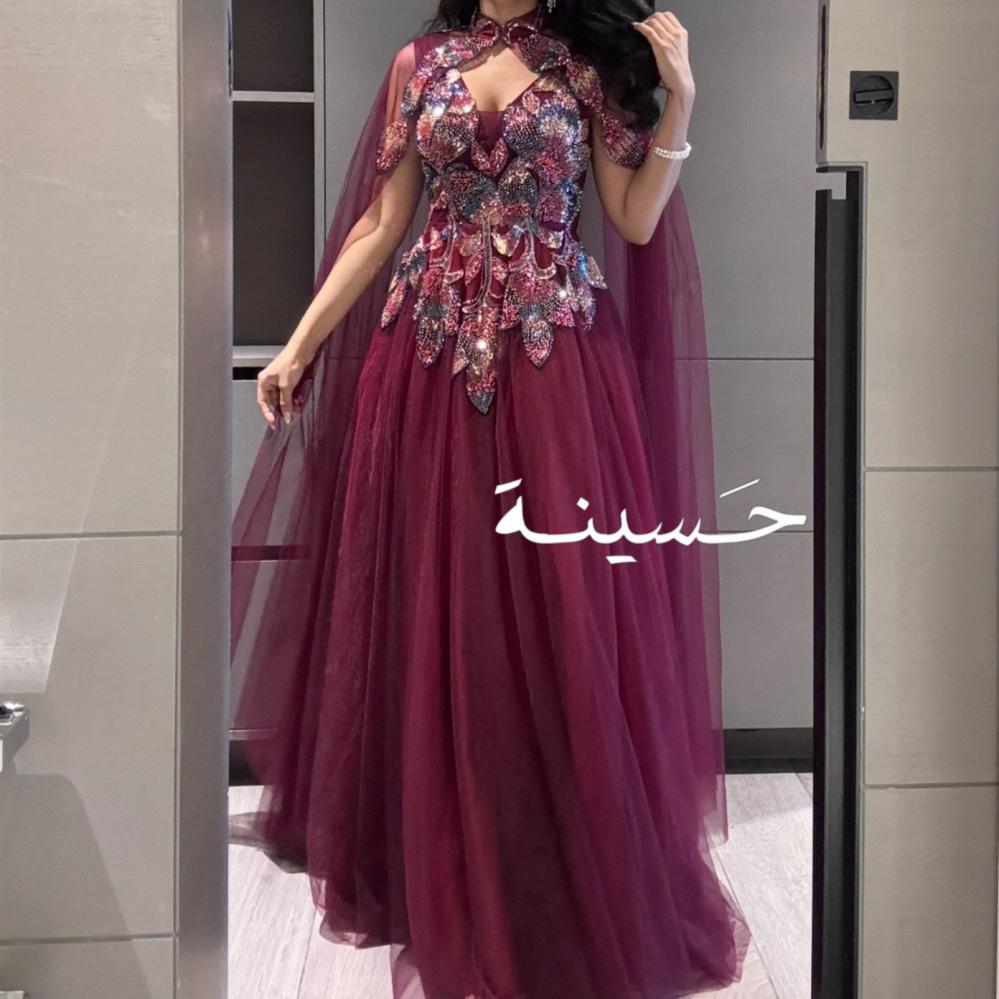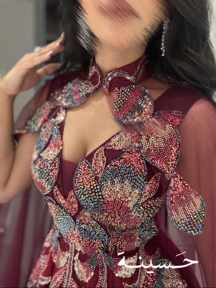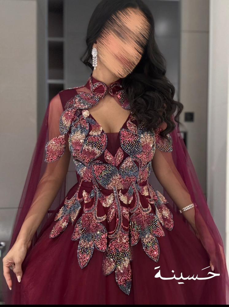 فستان تول عنّابي مطرّزفستان عنّابي مطرّز ملكيالقماش تول ناعم، بتطريز لامع فخم يغطي الصدر وينسدل على الأطراف.الكاب الشفاف الطويل يعطيه هيبة وأناقة تخلّيه يلفت الأنظار بكل سهرة