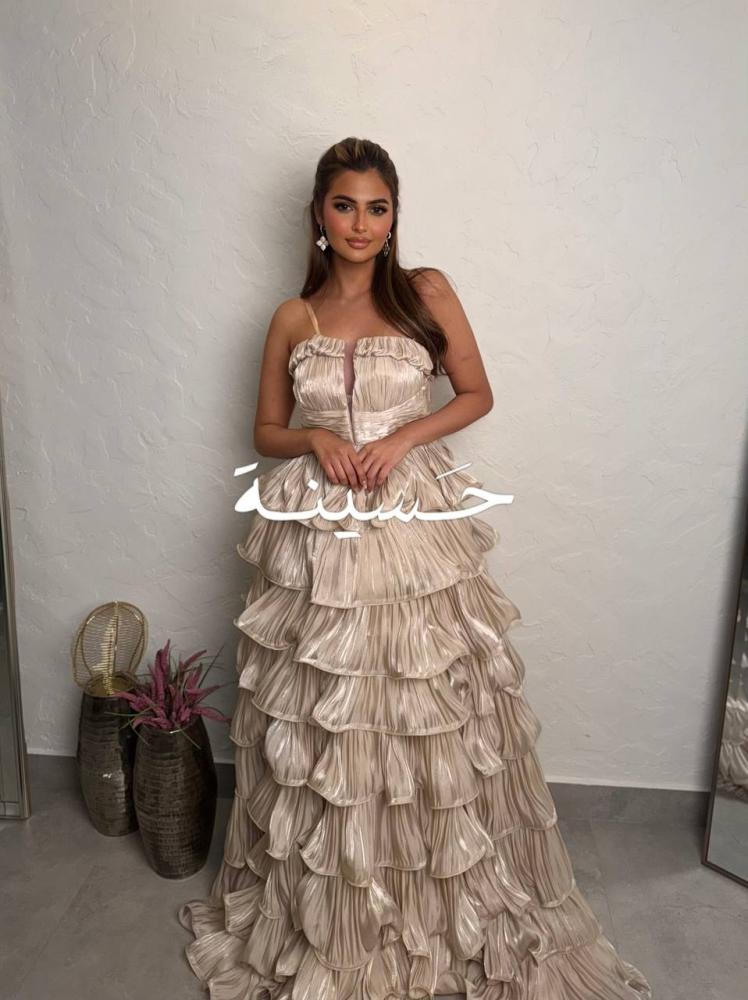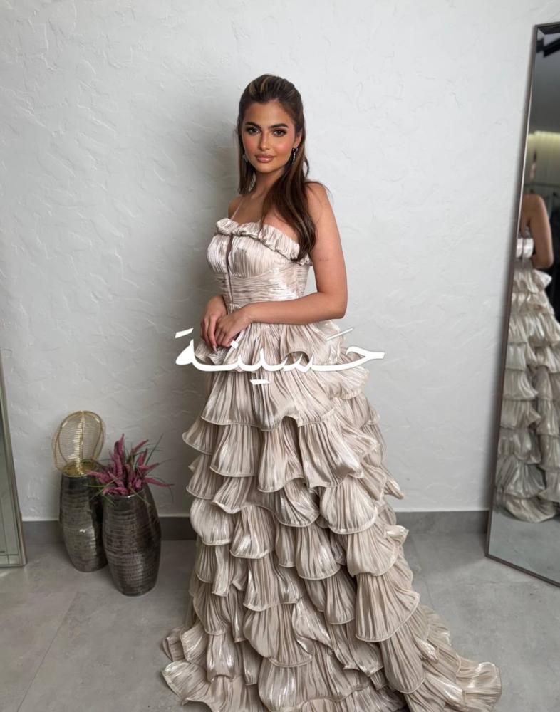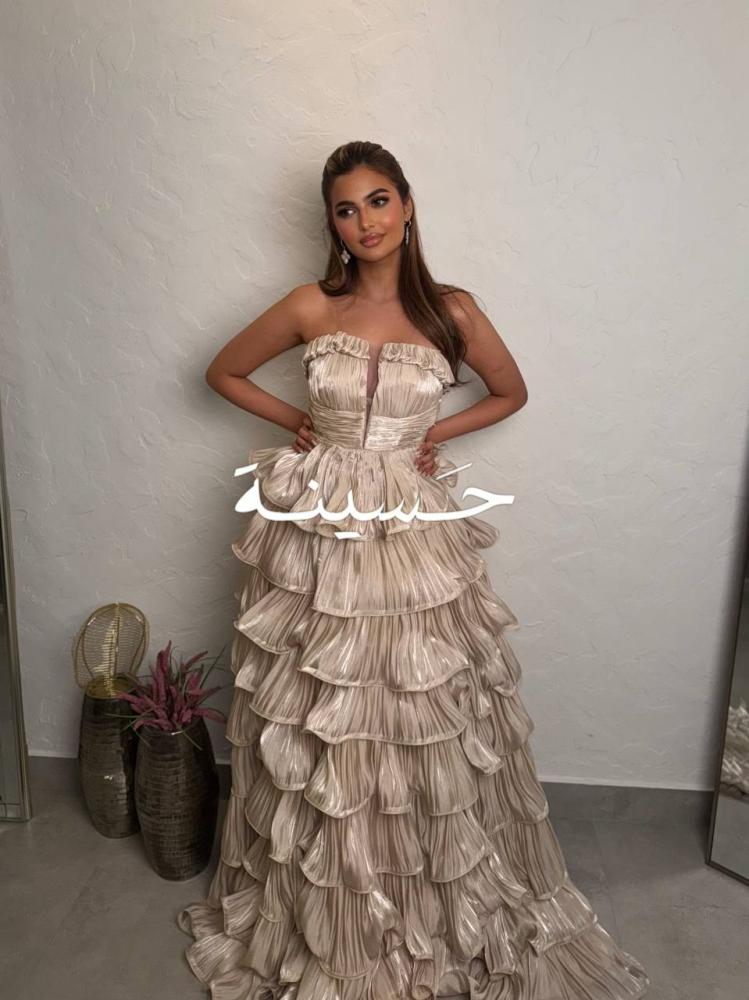 فستان سهرة بتصميم استثنائي يجمع بين الجرأة والأنوثة، مصنوع من قماش دانتيل مكسر بلمعة ناعمة تبرز تفاصيله الفريدة.