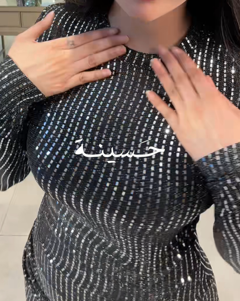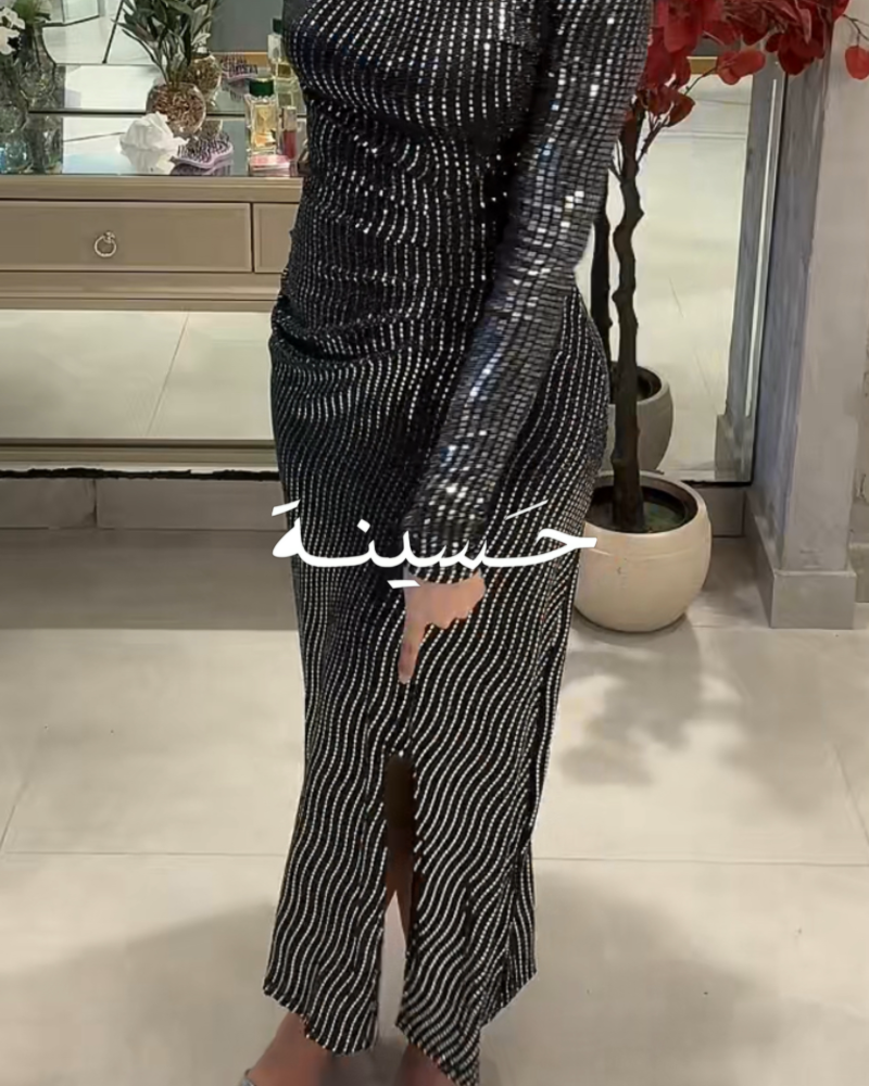 فستان مرايا مصغرة لماعفستان أسود بترتر لامع بخطوط عمودية، يتميّز بقصّة ضيّقة وأكمام طويلة مع فتحة أمامية ناعمة. التصميم يبرز القوام بأسلوب عصري وراقي، مثالي للسهرات بإطلالة جريئة وأنيقة