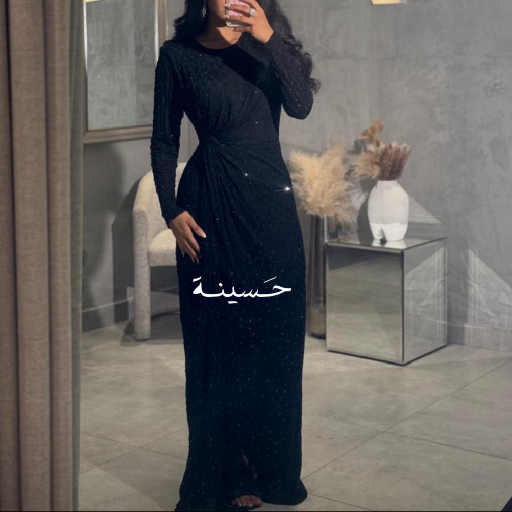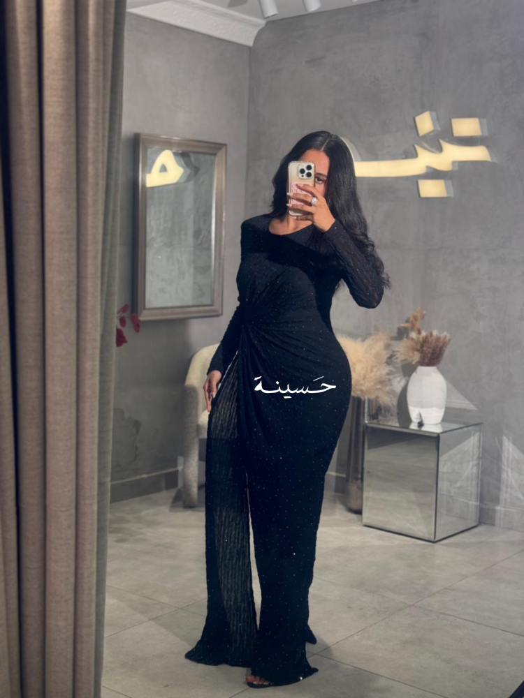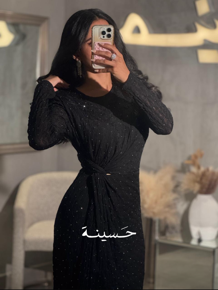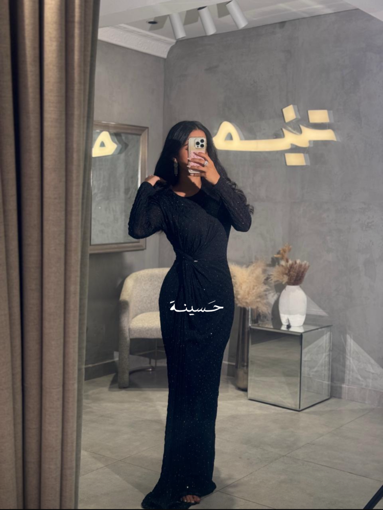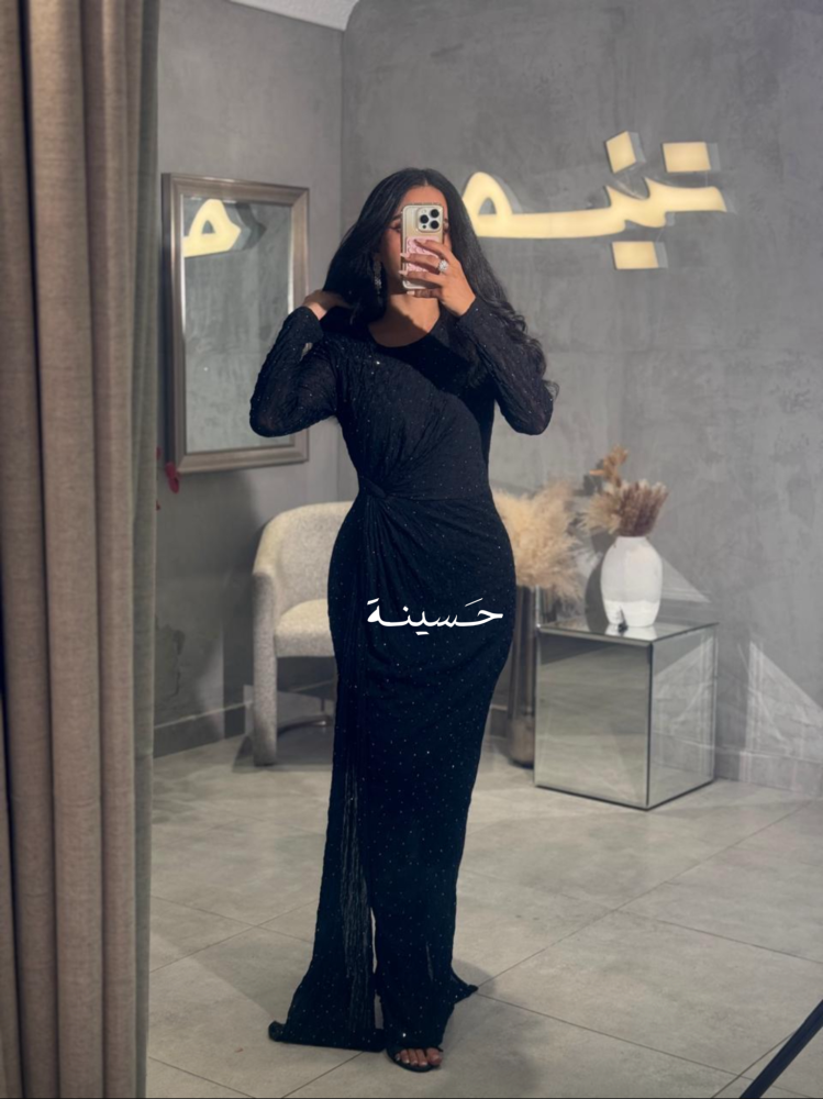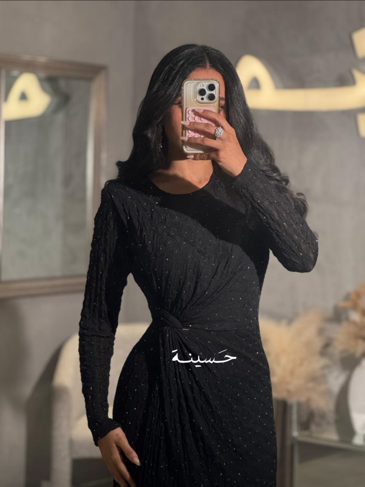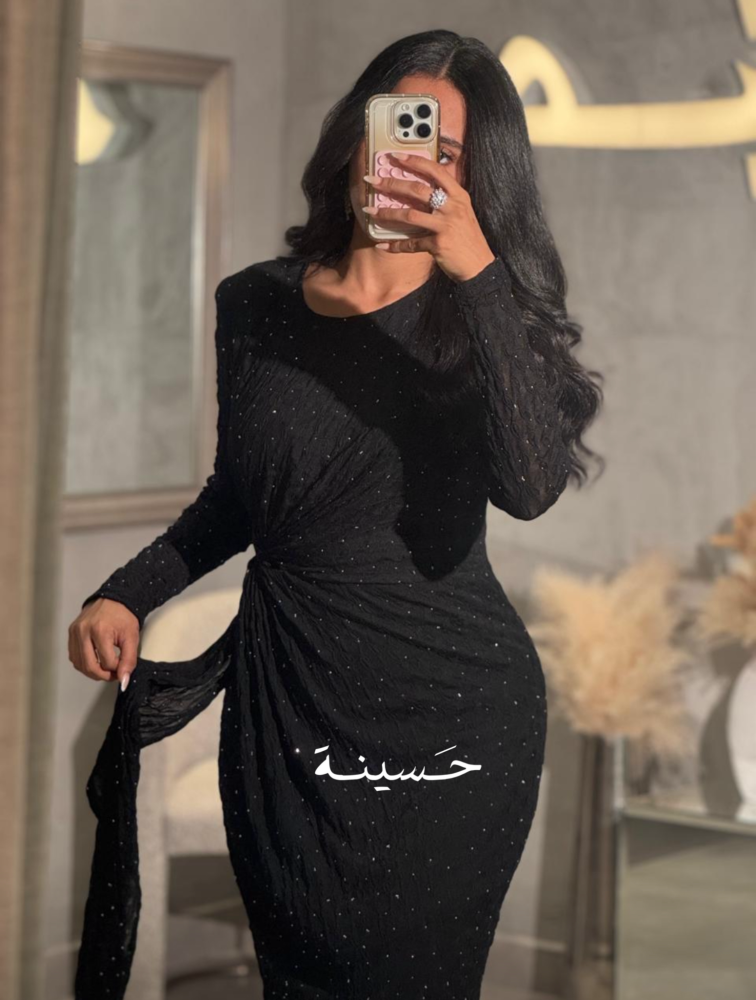 فستان أسود طويل بلمعة هاديةفستان أسود ناعم بلمعة متناثرة كأنها نجوم، مع كسرات على الخصر تعطي شكل منحوت وأناقة رصينة وراقية.