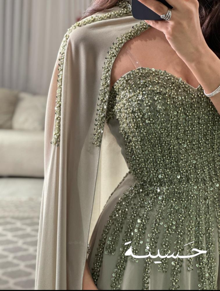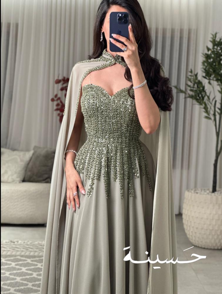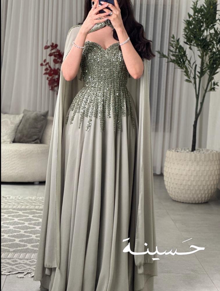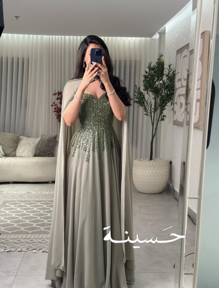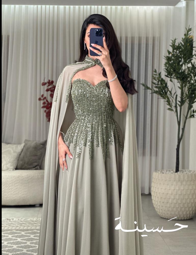 لون زيتي مائل على الرمادي، قصّة كورسيه مطرزة بترتر لامع مرتب بشكل يضفي لمعة راقية، مع كتف مفتوح وكاب من الشيفون النازل يعطي إيحاء ملكي وكأنها إطلالة أميرات. القماش السفلي خفيف وواسع ينزل بانسيابية رايقة