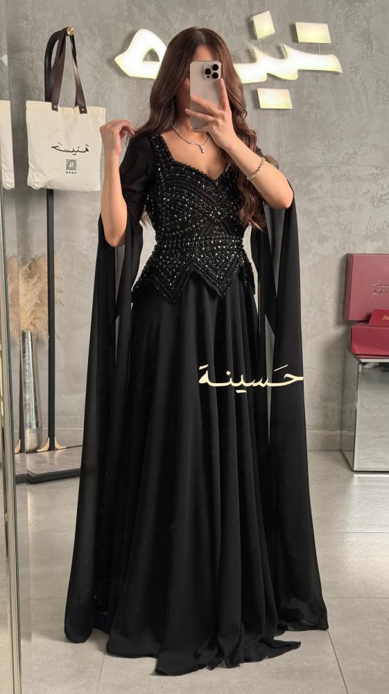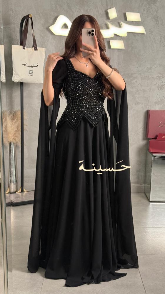 فستان أسود ساحر بتطريز يدوي فاخر من الخرز اللامع ينساب بانسيابية على الصدر والخصر بتفاصيل هندسية دقيقة.