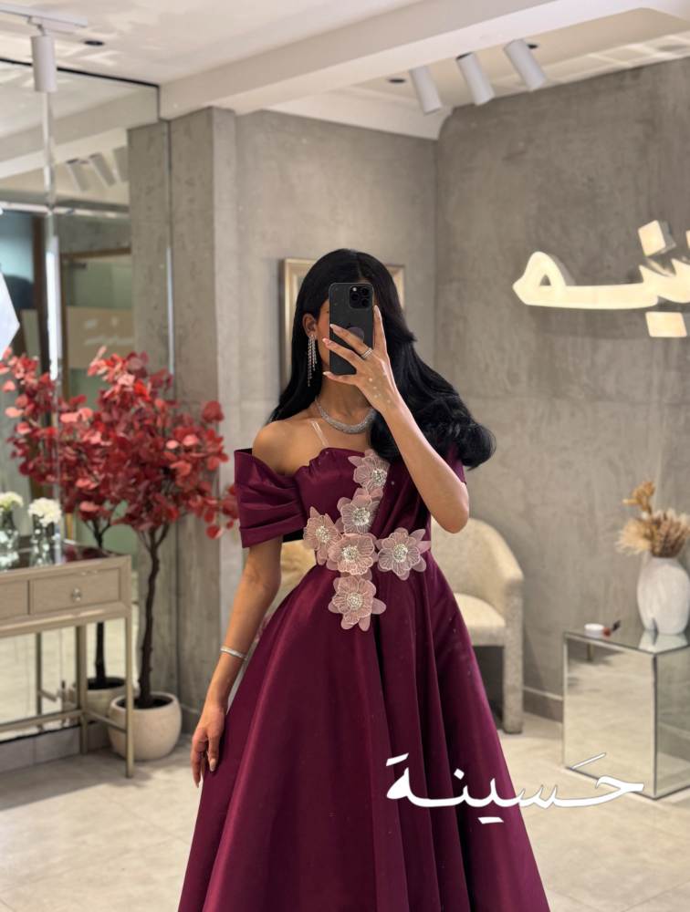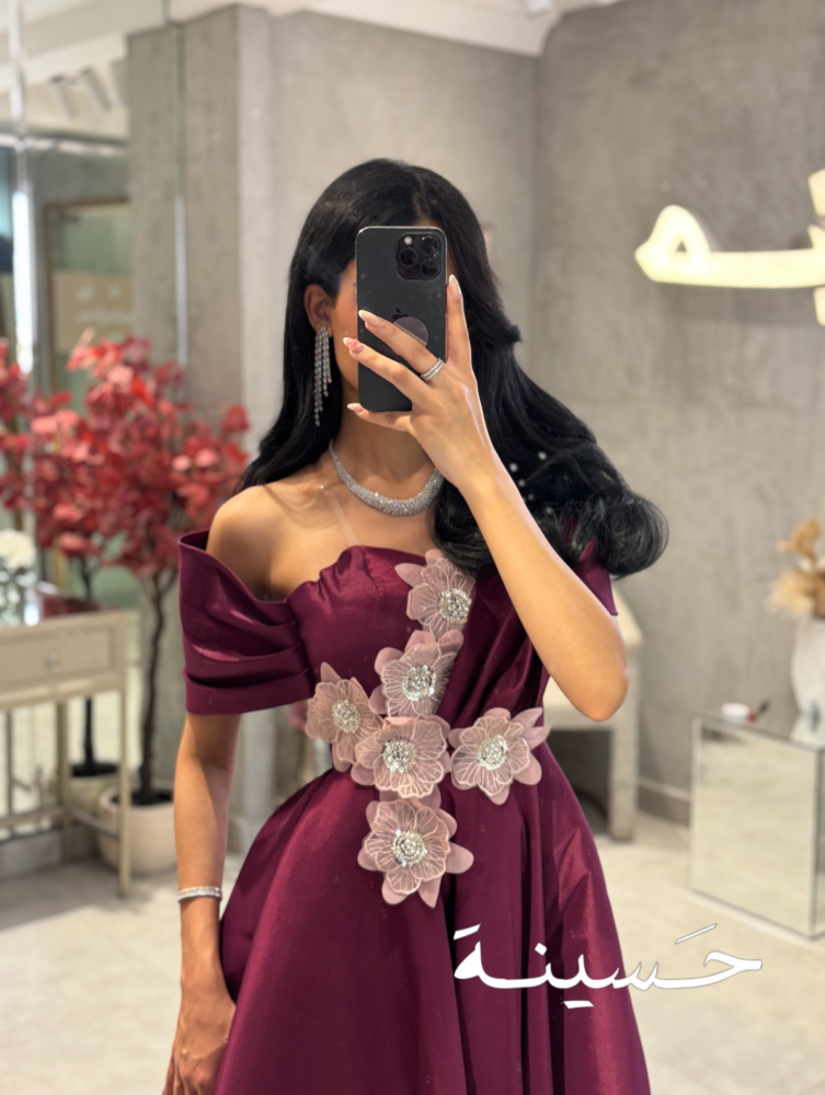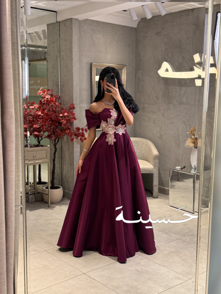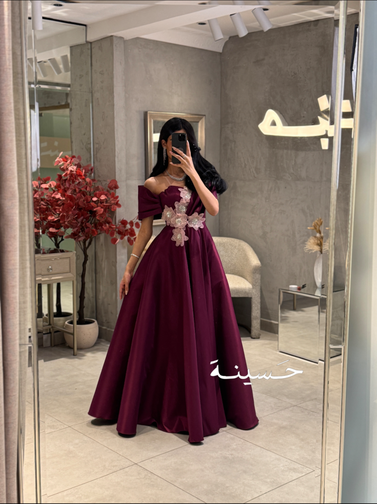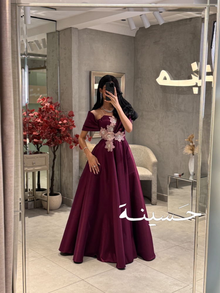 خامة الفستان من ساتان فاخر، ناعم وثقيل يعطي ثبات وأناقة في الحركة، بلمعة خفيفة تضيف له فخامة راقية بدون مبالغة. التطريز مصنوع من تول مطرز ودانتيل ناعم، بتفاصيل وردية بارزة وموزعة بشكل مائل على الخصر، تعطي لمسة فنية جذابة وتكسر بساطة القماش بطريقة راقية ومتقنة