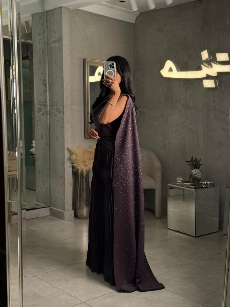 الكتف الواحد مع شال جانبي طويل مزيّن بالرقي، يمنح الفستان لمسة فنية لافتة تضيف حضوراً مميزاً في كل مناسبة.