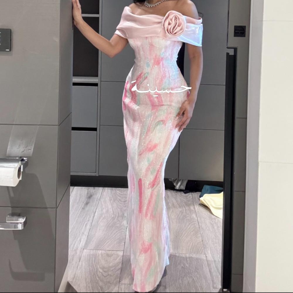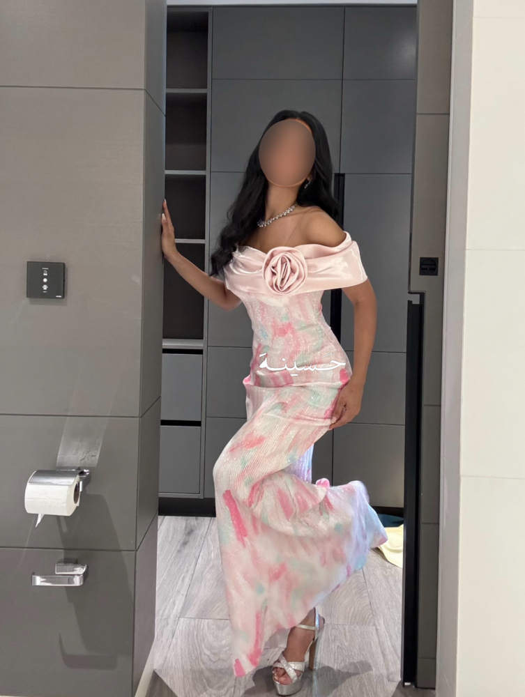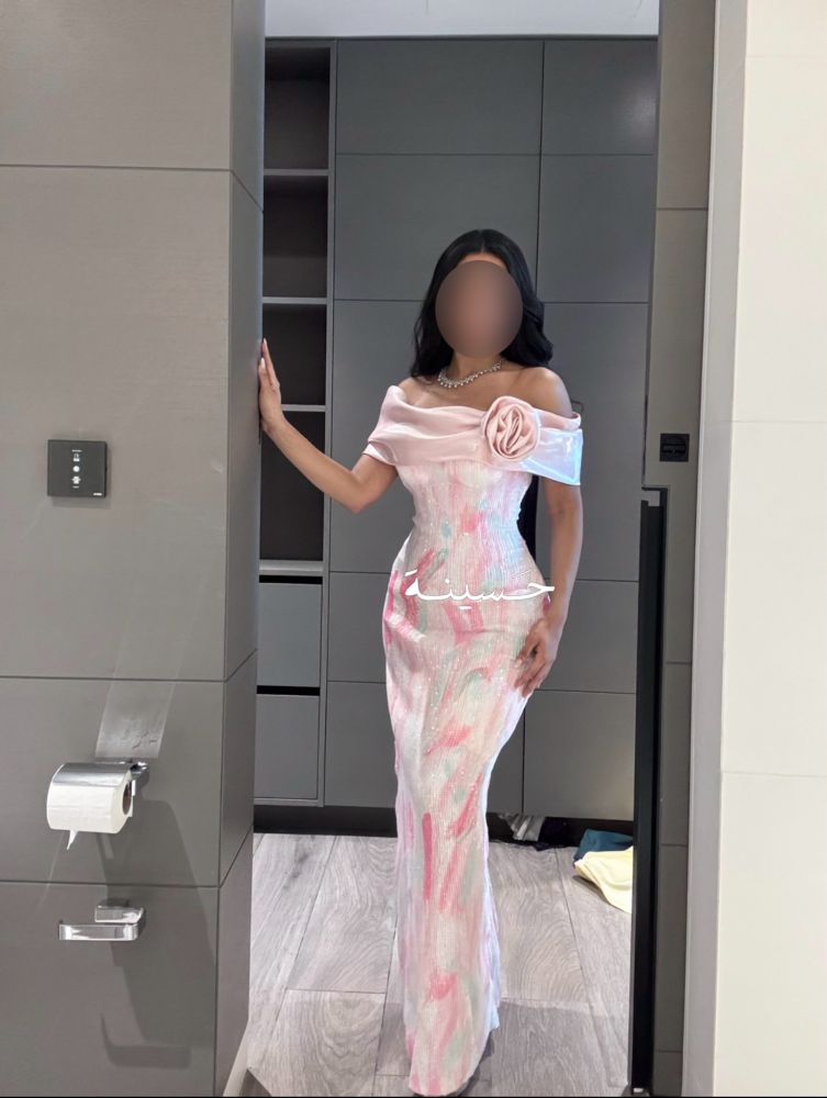 فستان وردي لامع بكتف مكشوف ووردةفستان ضيق بنقشة فرشاة بألوان ناعمة، بقصة كورسيه وكتف مكشوف مزين بوردة، تصميم فني جريء وأنثوي