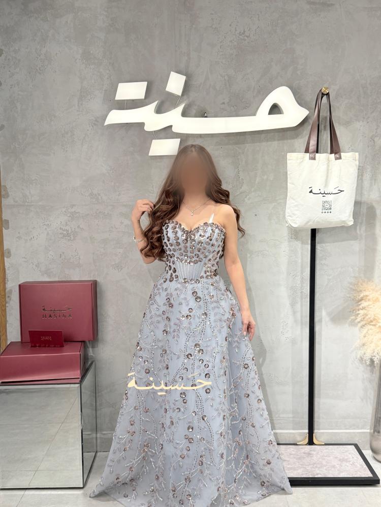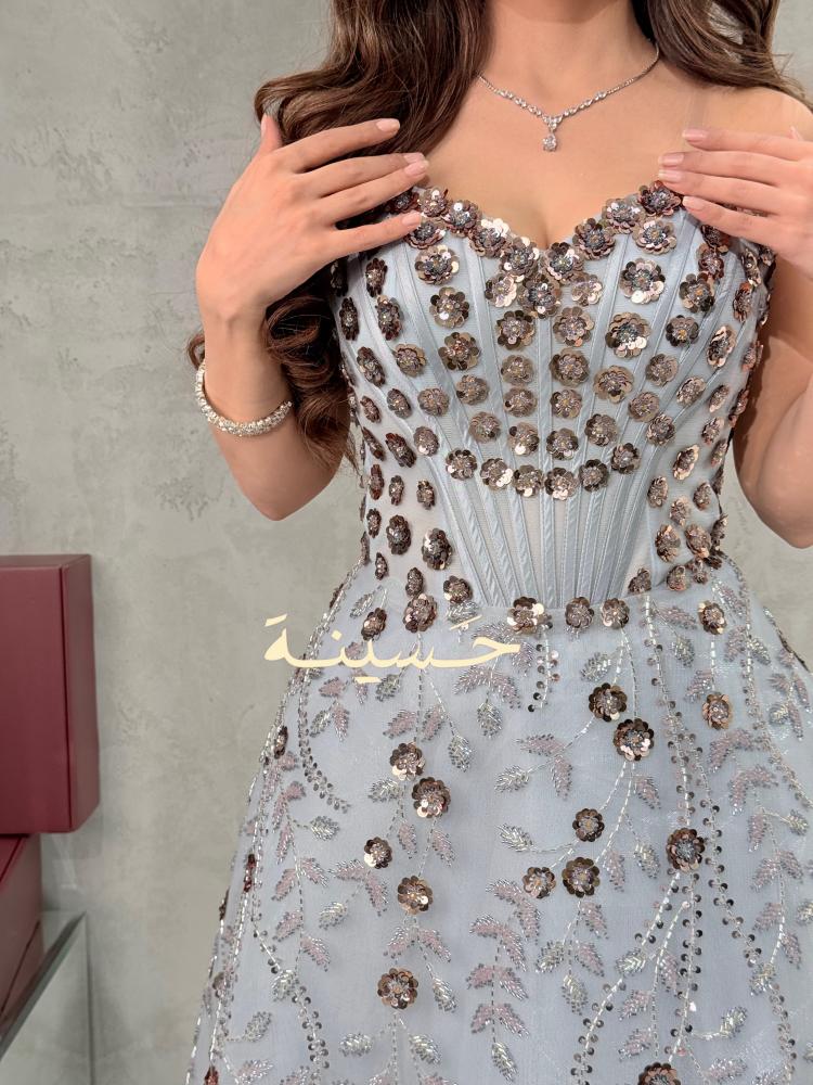 تصميم الكورسيه يبرز الخصر بأسلوب أنثوي ناعم، بينما تنساب التطريزات نزولًا بخفة تمنح الإطلالة لمسة ملوكية تجمع بين الرقي والبريق بأسلوب حسينة المتفرّد