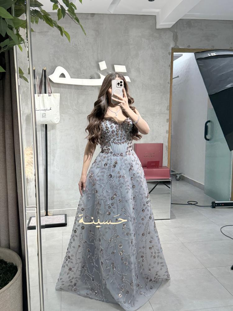 فستان سهرة راقٍ بلون رمادي فاتح بتفاصيل براقة مطرزة يدويًا على شكل زهور كريستالية متلألئة.