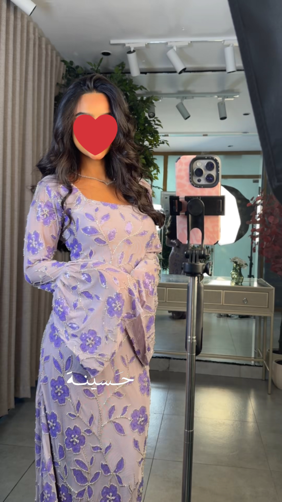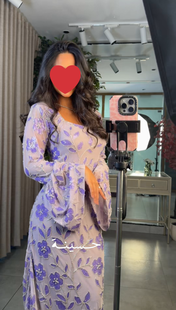 فستان ليلكي فاتح من تول مطرّز بنقشة ورود بنفسجية، القصة ضيقة من الخصر ومنسدلة للأسفل، مع كمام واسعة تعطي لمسة كلاسيكية وناعمة. خامته خفيفة ومريحة، مثالي للمناسبات النهارية أو لمسة أنثوية ساحرة بالسهرة.