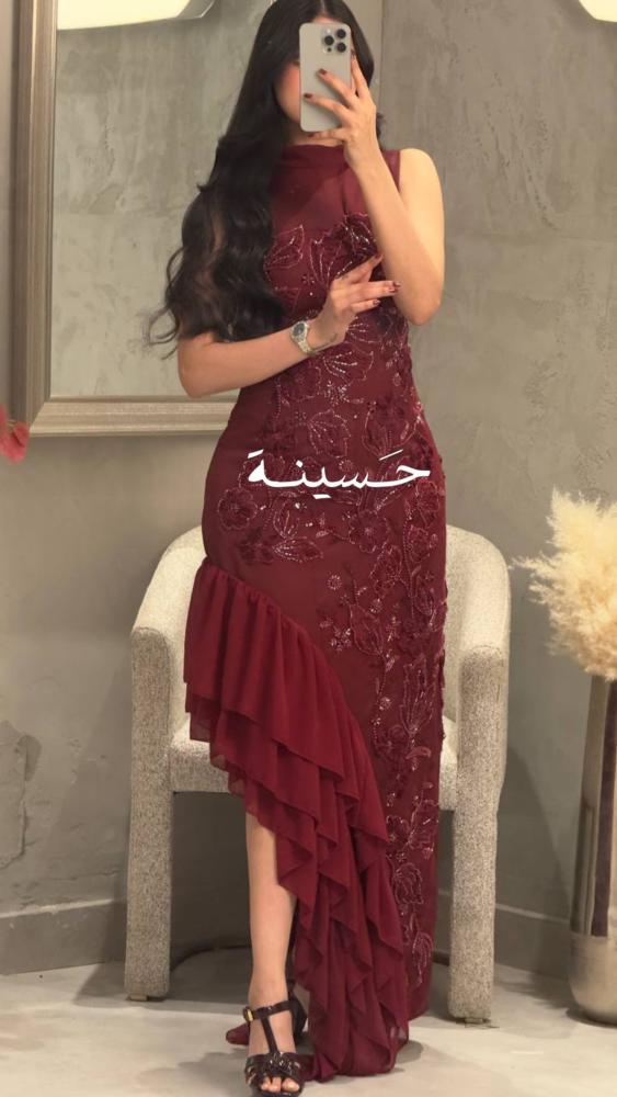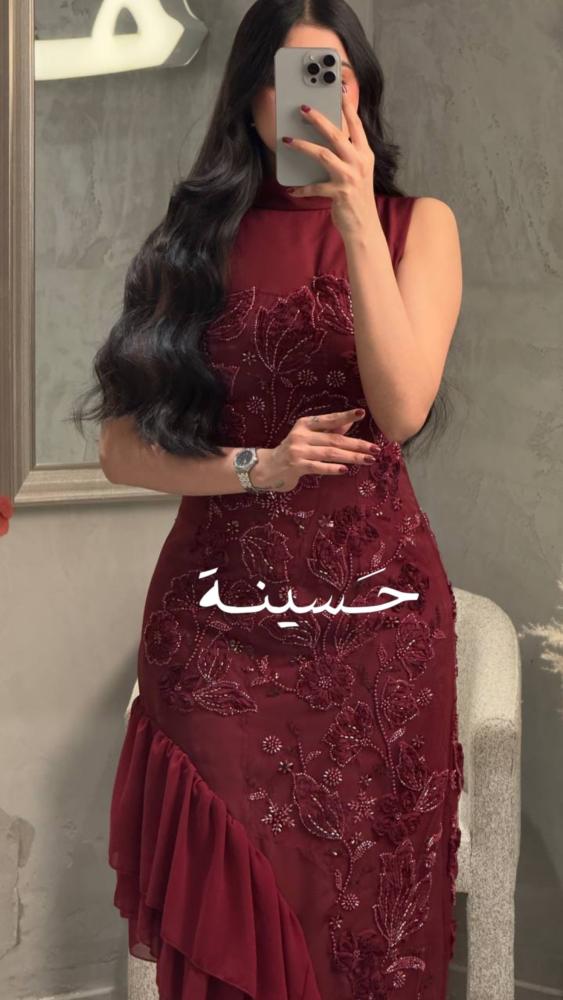 فستان وهج كرزي مخمليفستان عنّابي فاخر بدون أكمام، مصنوع من قماش مطرّز بتفاصيل وردية فخمة، يتميّز بقصّة ضيّقة مع كشاكش جانبية منسابة تضيف لمسة أنثوية عصرية. مثالي لإطلالة جريئة وراقية في المناسبات الخاصة