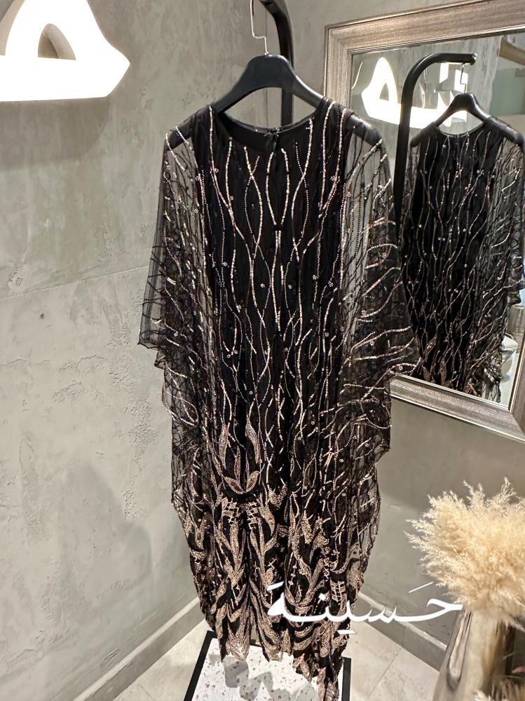 مصنوعة من شيفون خفيف مطرّز بخيوط لامعة تعكس الإضاءة، مع بطانة سوداء ناعمة تعطي انسيابية وأناقة. تصميم واسع ومريح، يجمع بين الراحة والفخامة ويخليها خيار مثالي للمناسبات والسهرات