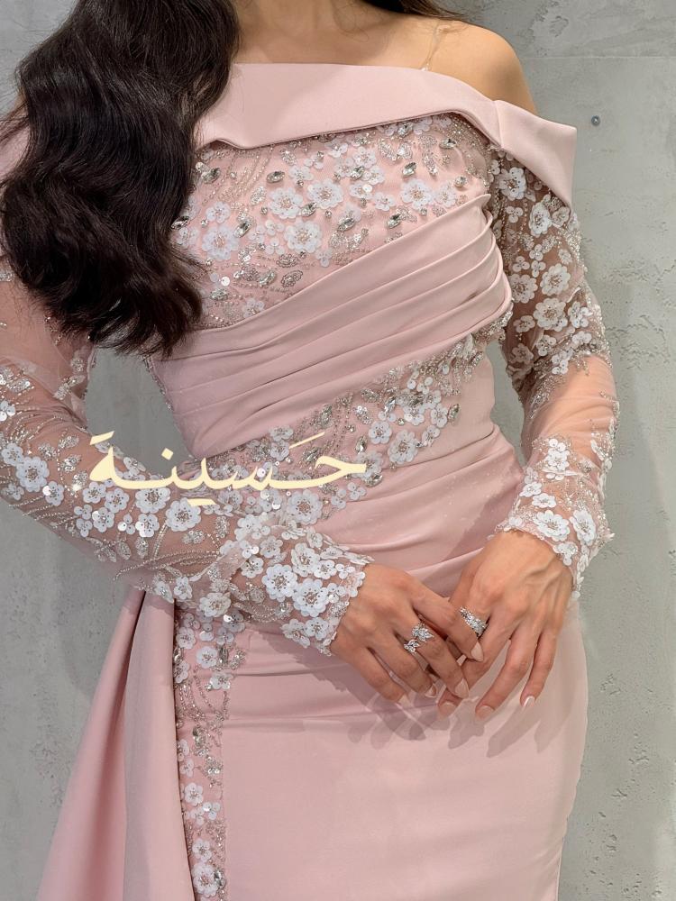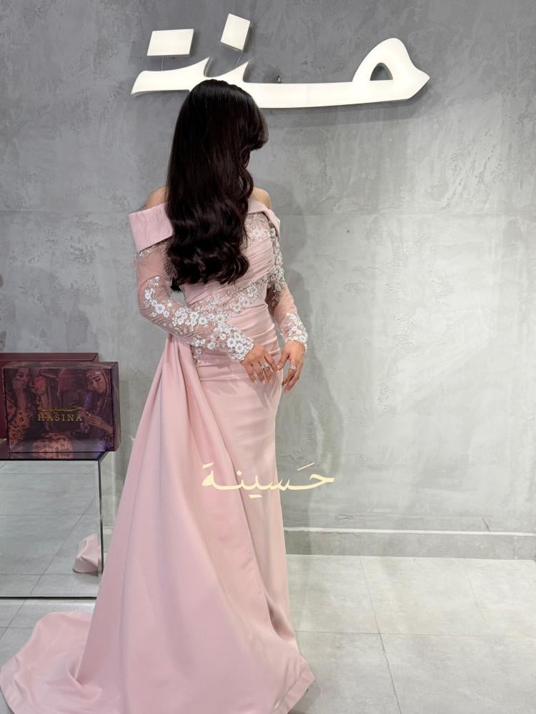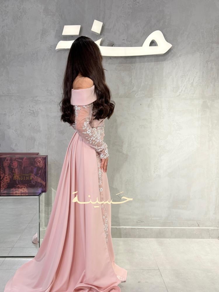 فستان سهرة أنيق باللون الوردي الفاتح، يتميز بقصة أوف شولدر تزيد من أنوثة الإطلالة. مطرز يدوياً بتفاصيل زهرية فاخرة من الكريستال والخرز على الصدر والأكمام الشفافة لمسة رومانسية راقية. التصميم ينساب بخطوط ضيقة تبرز القوام، مع شق جانبي وتفاصيل انسيابية من القماش تضيف فخامة وجرأة ناعمة. خيار مثالي للحفلات والمناسبات الخاصة لإطلالة ملكية تخطف الأنظار