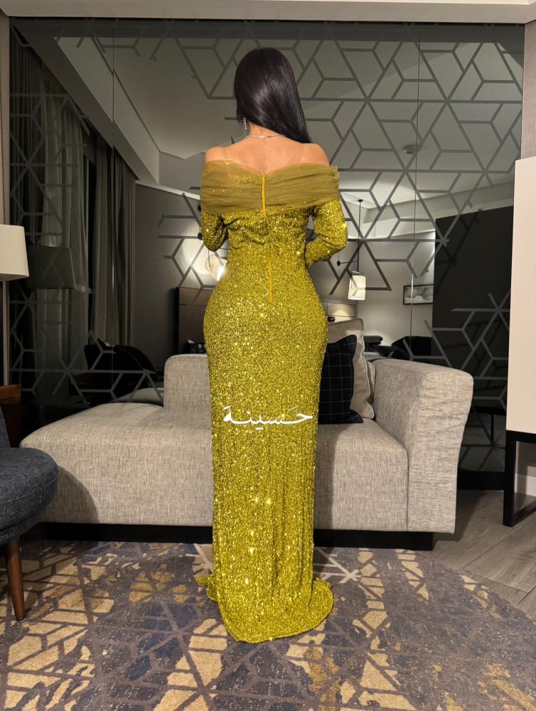 فستان بريق الذهب الملكيفستان يلمع كالشمس وقت الغروب، بقماش ترتر ذهبي يشع أنوثة وثقة. تصميم الكتف المكشوف مع الشيفون الشفاف يعطيه لمسة ناعمة توازن بين الجرأة والفخامة