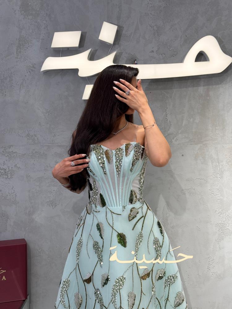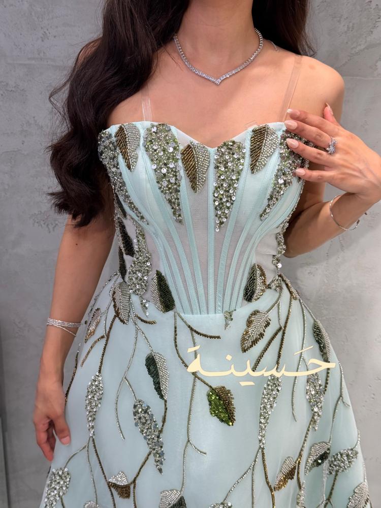 فستان سهرة ساحر بلون أخضر فاتح، مصمم بكورسيه أنثوي بارز، مزين بتطريز يدوي فاخر على شكل أوراق براقة من الكريستال والترتر بألوان متدرجة من الفضي والذهبي والأخضر. القصة الواسعة المنسدلة تمنح إطلالة ملكية ناعمة، لتجعله خياراً مثالياً للمناسبات الخاصة وحفلات المساء التي تحتاج لحضور أنثوي متألق