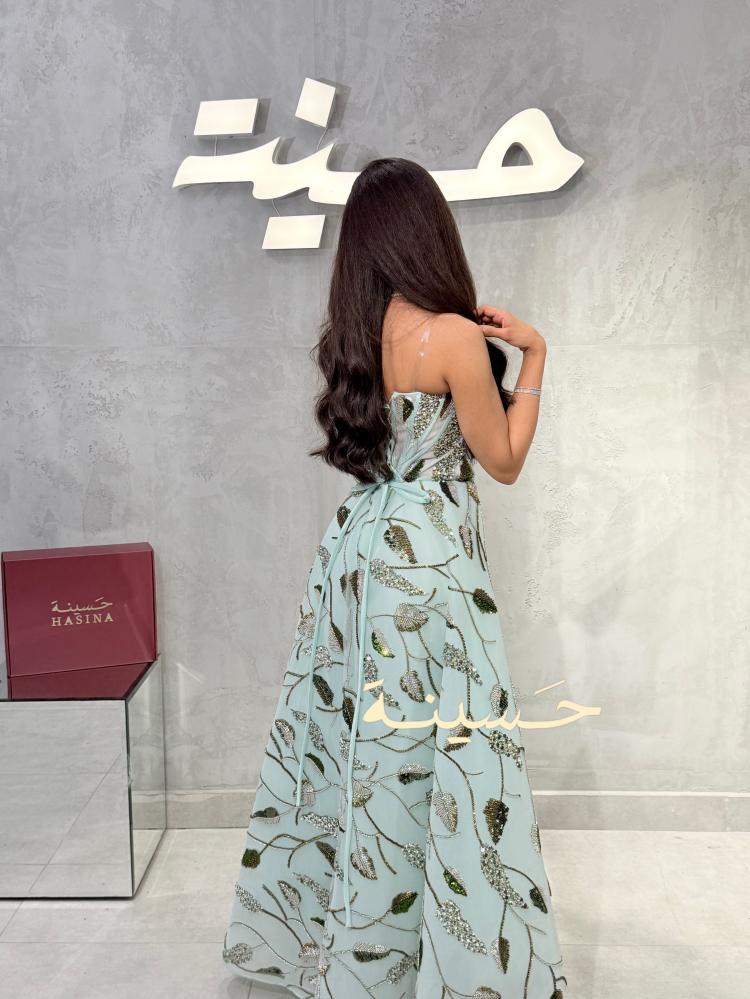 فستان سهرة أخضر فاتح مطرز بأوراق كريستالية