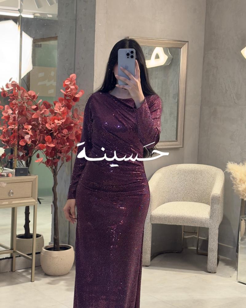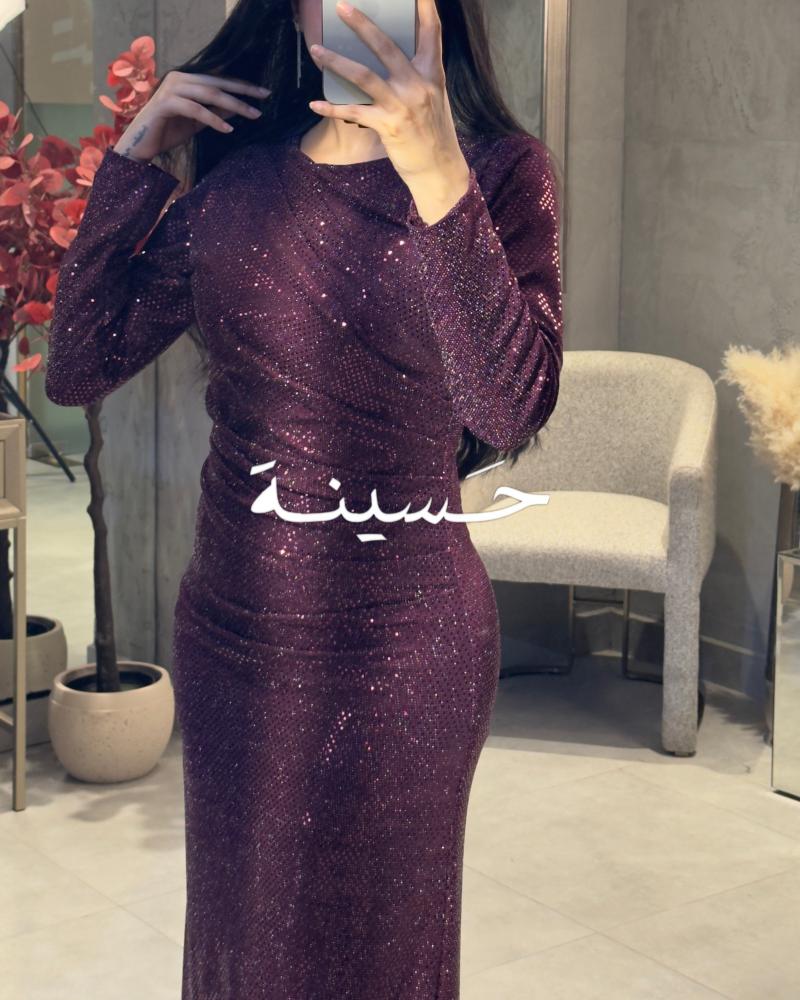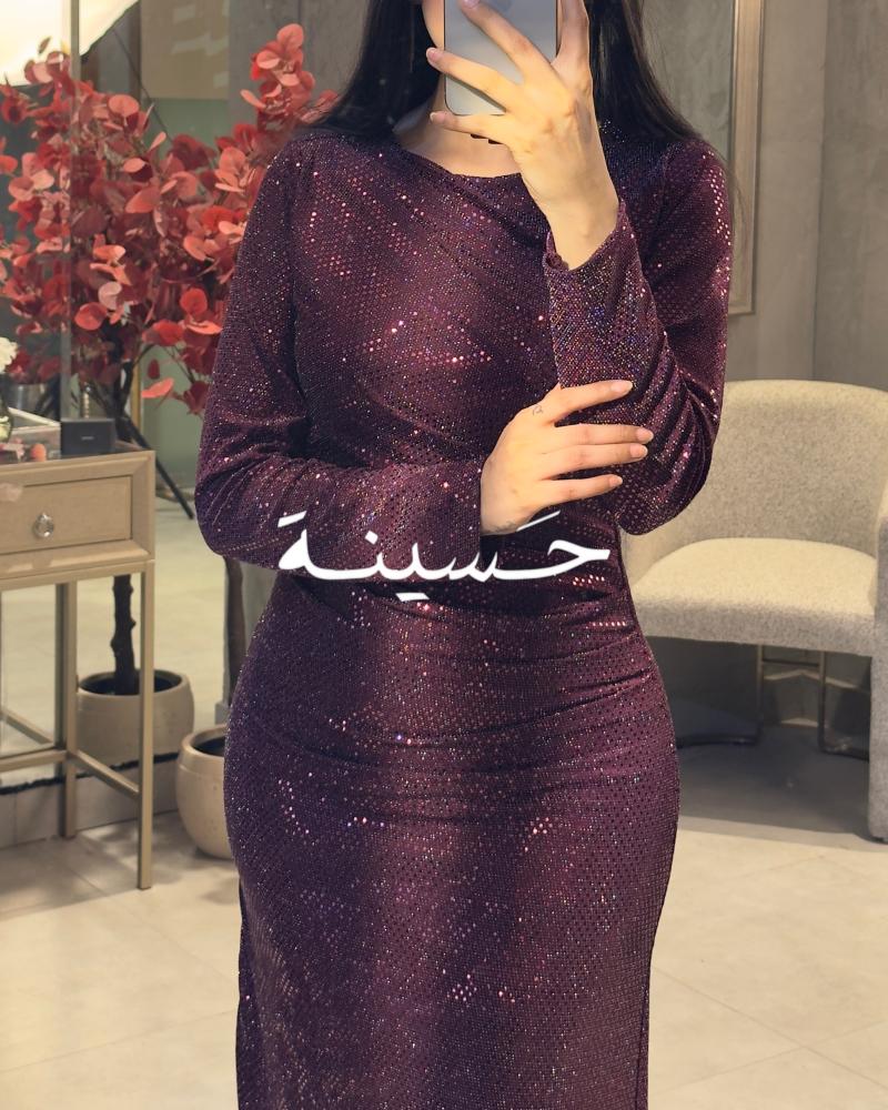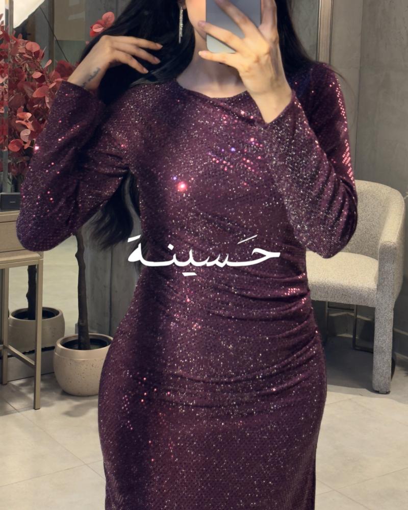 فستان موف لماعفستان خمري براق بقماش ترتر مرن، يتميّز بقصّة ضيّقة مع درابيه ناعم عند الخصر والصدر، وأكمام طويلة تضيف لمسة أنثوية فخمة. تصميم مثالي للسهرات بإطلالة جريئة وأنيقة.