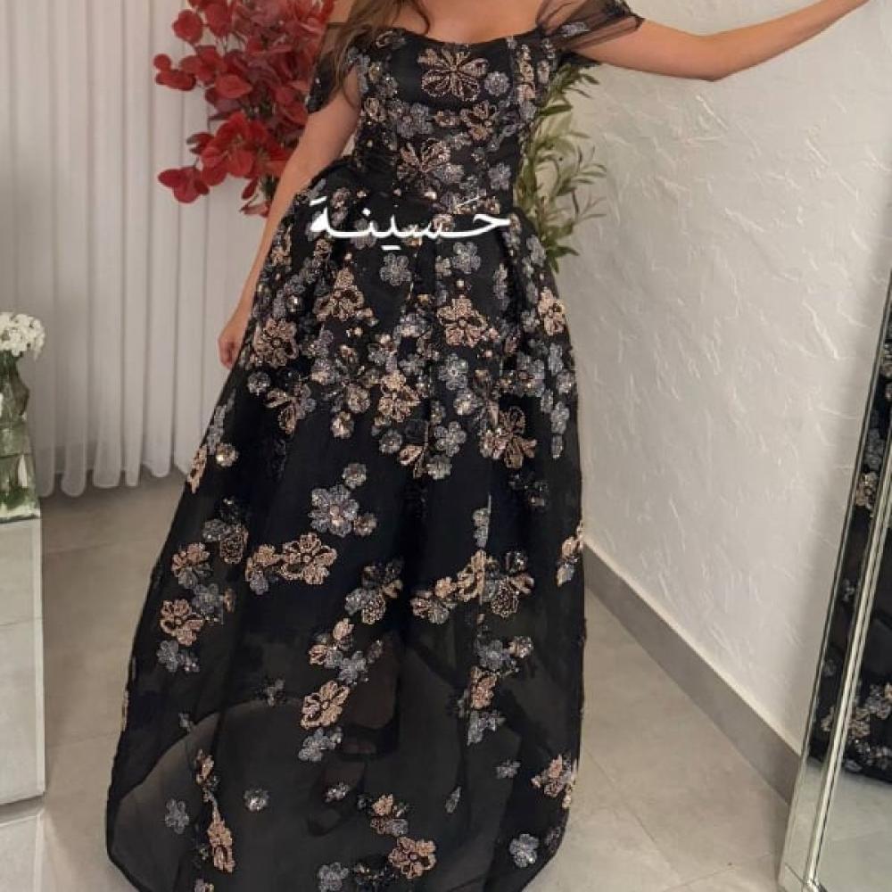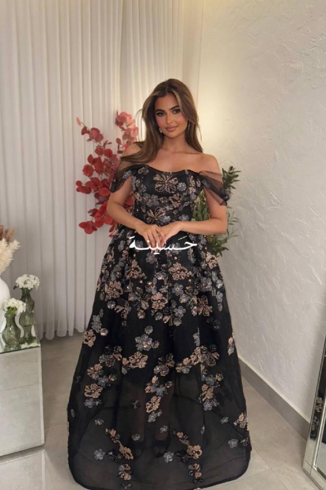 فستان سهرة فاخر مصنوع من قماش التل المطرز بالكامل بنقوش زهرية بارزة وتطريز لامع يمنح الفستان لمسة فخمة ومميزة.