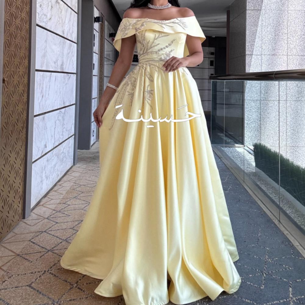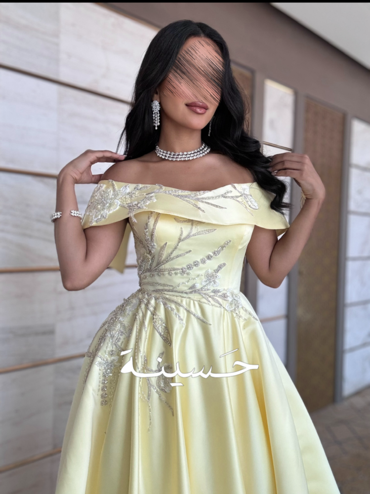 فستان أصفر بتطريز ناعمفستان أصفر باستيل ناعم بتصميم أوف شولدر وتطريز فضي أنيق، يعطي إشراقة ناعمة وأناقة ملكية ساحرة.