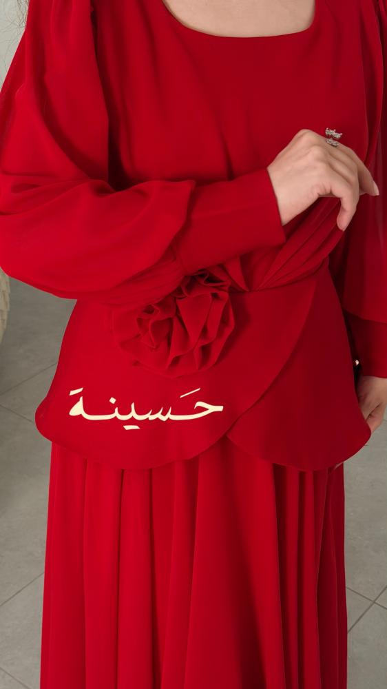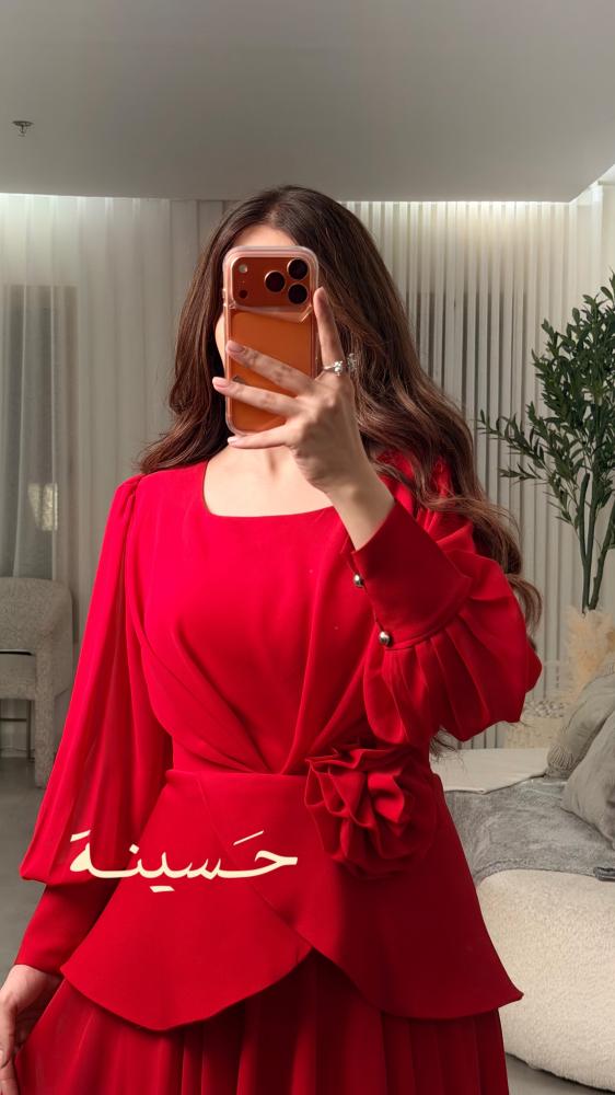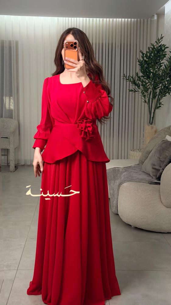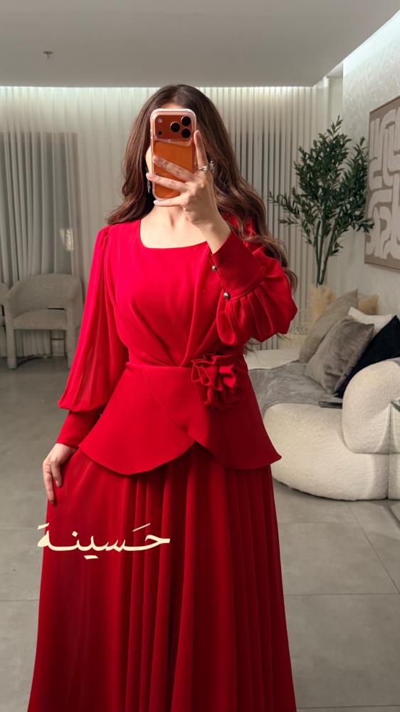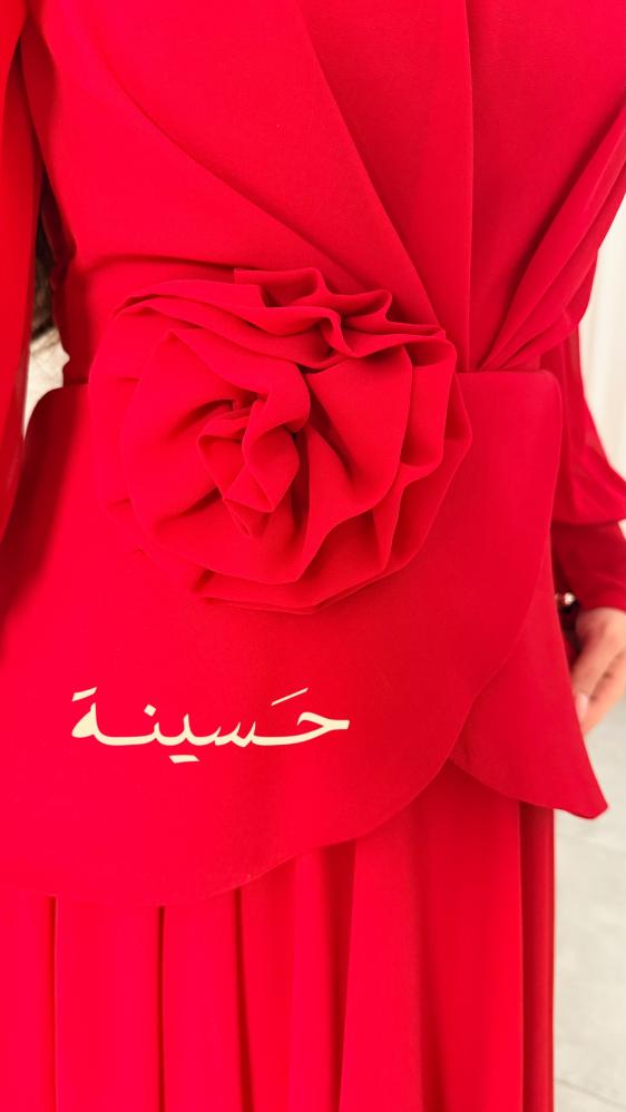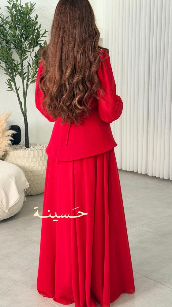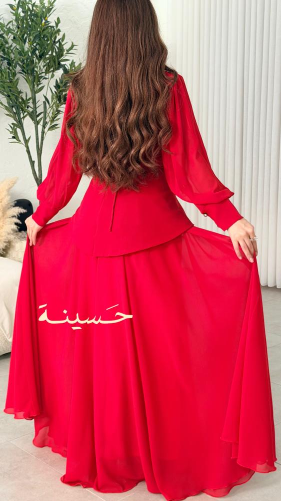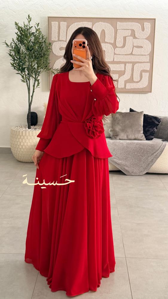 فستان أحمر ساحر بتصميم يجمع بين الأناقة الكلاسيكية والتفاصيل الأنثوية الراقية.