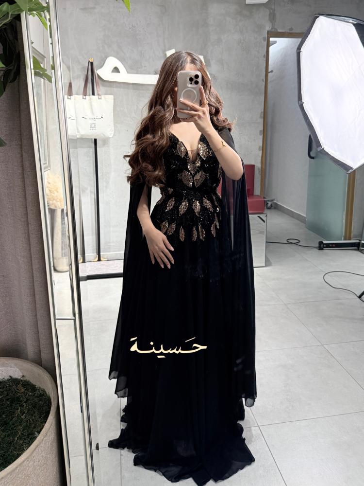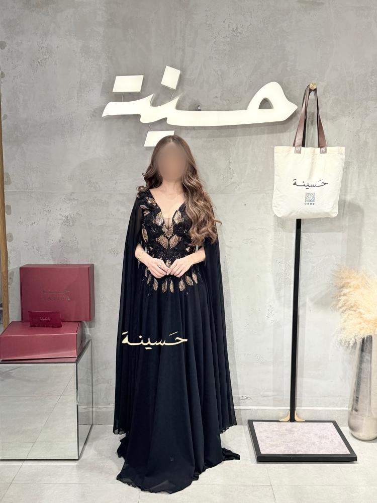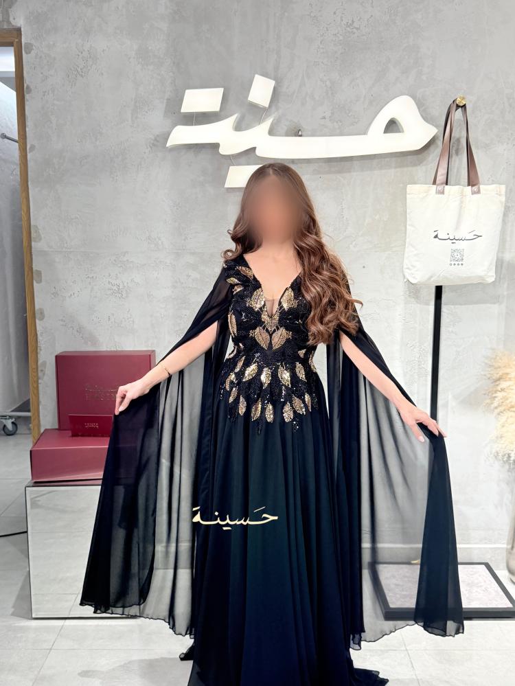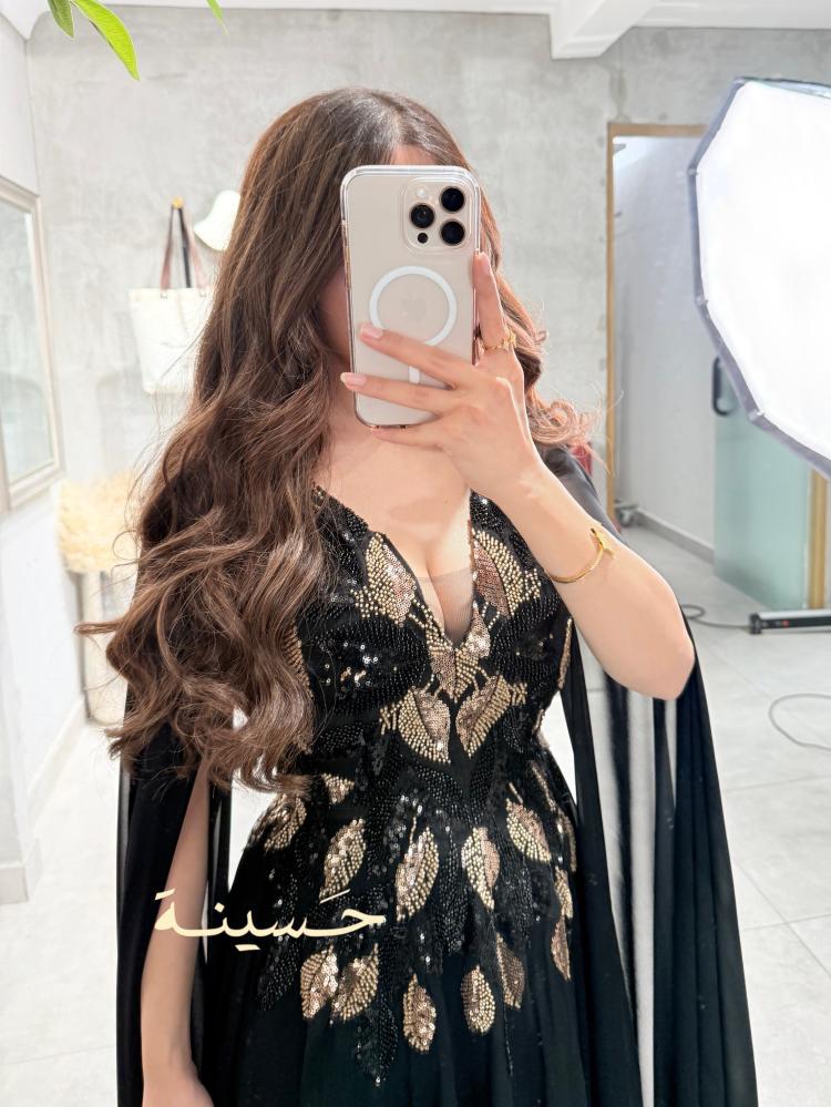 فستان سهرة فخم بلون أسود مخملي بتصميم انسيابي يلفت الأنظار بتفاصيله اللامعة المطرزة بخيوط ذهبية تعكس الضوء بفخامة.