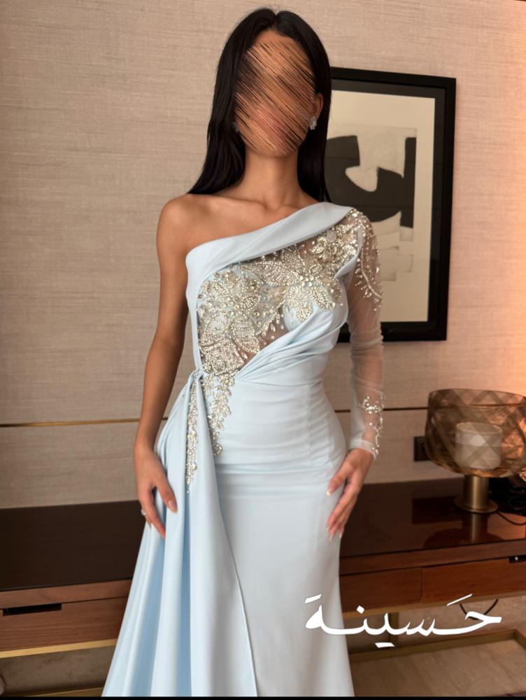 - التصميم: كتف واحد (One Shoulder) مع كم شفاف مطرز بالكريستال والخرز اللامع.