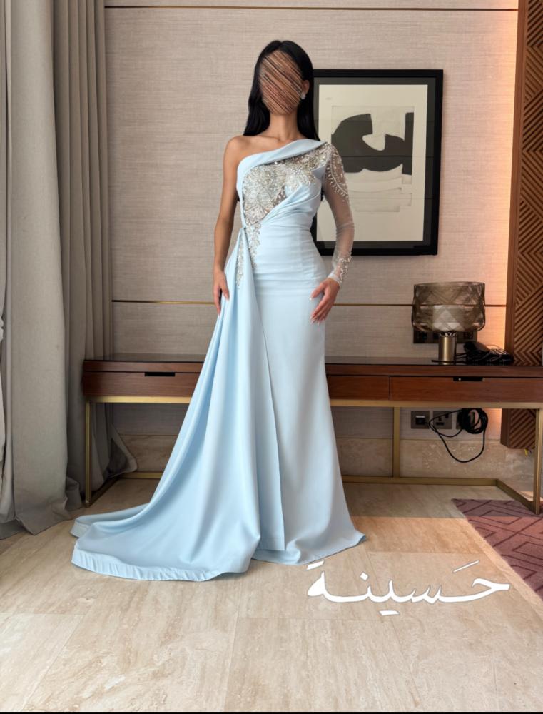فستان سماوي كتف واحد مطرز