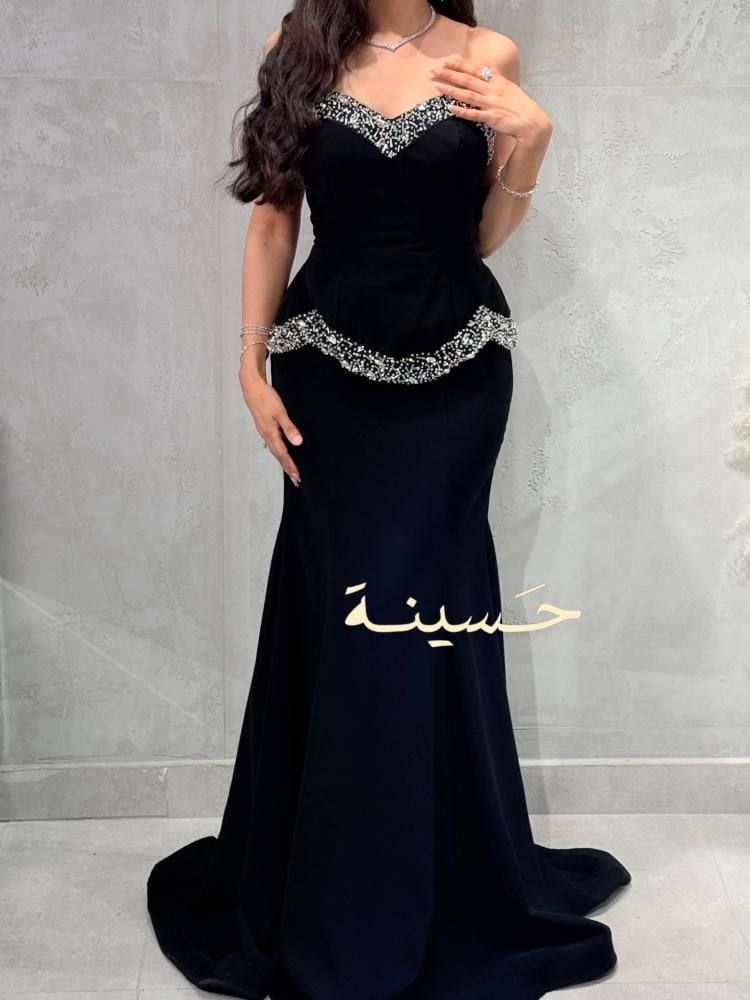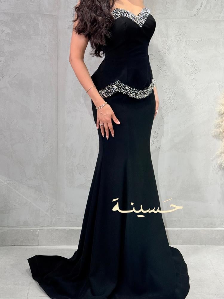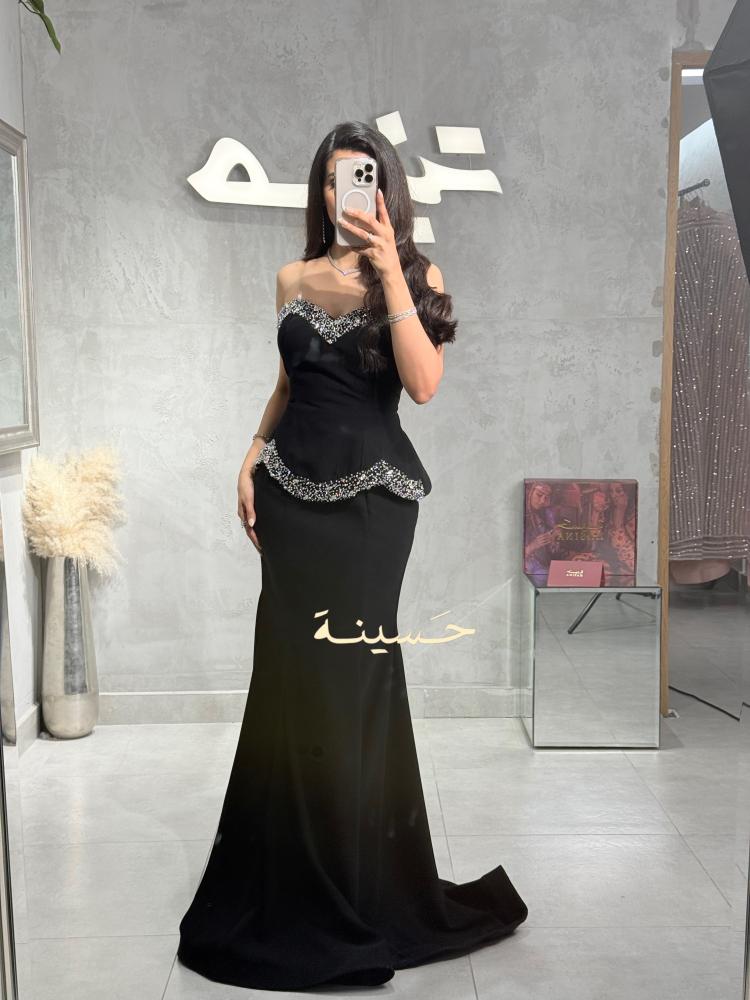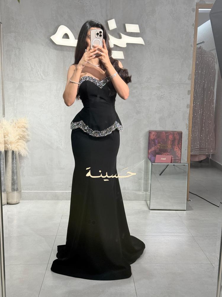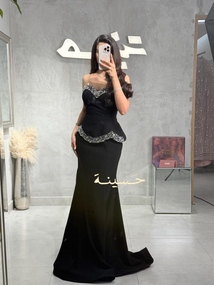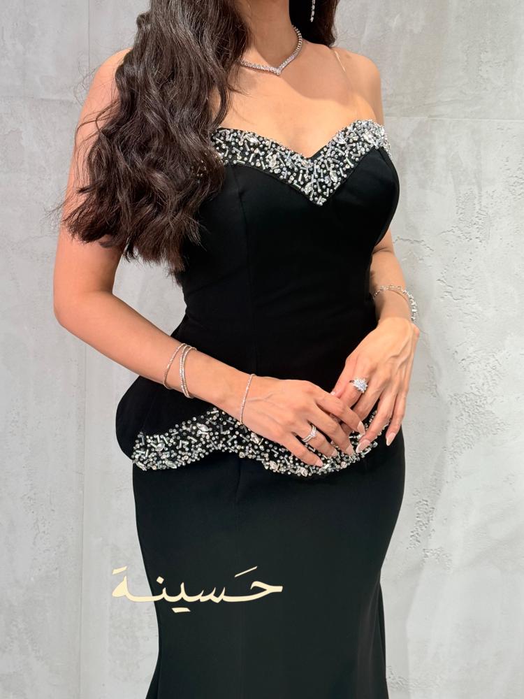 فستان سهرة أسود أنيق بتصميم كلاسيكي جذاب يجمع بين البساطة والفخامة. يتميّز بقصّة ضيّقة تبرز القوام بأسلوب راقٍ، مع صدرية كورسيه بتفاصيل مطرّزة يدوياً بالكريستالات اللامعة والخرز الفاخر على طول الحافة وأعلى الخصر لإضفاء لمسة براقة آسرة