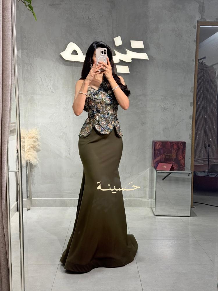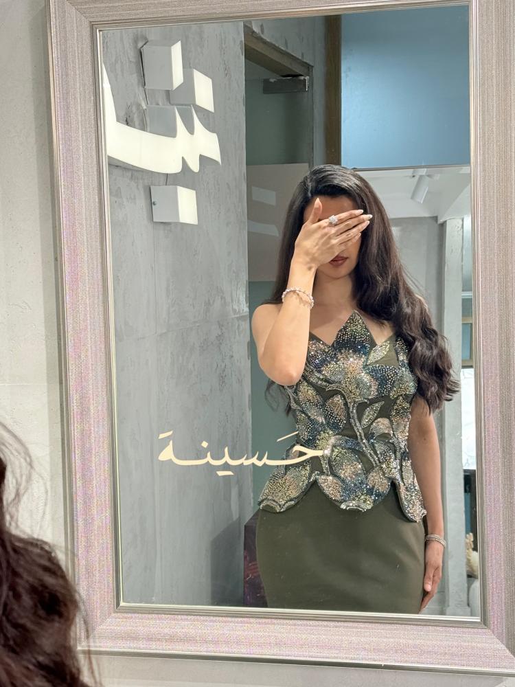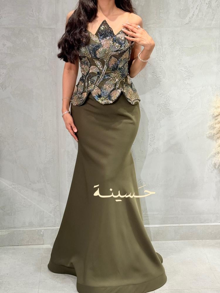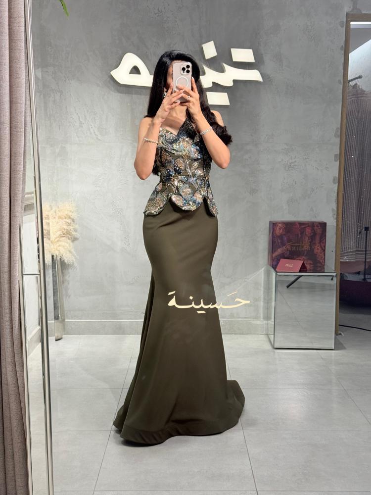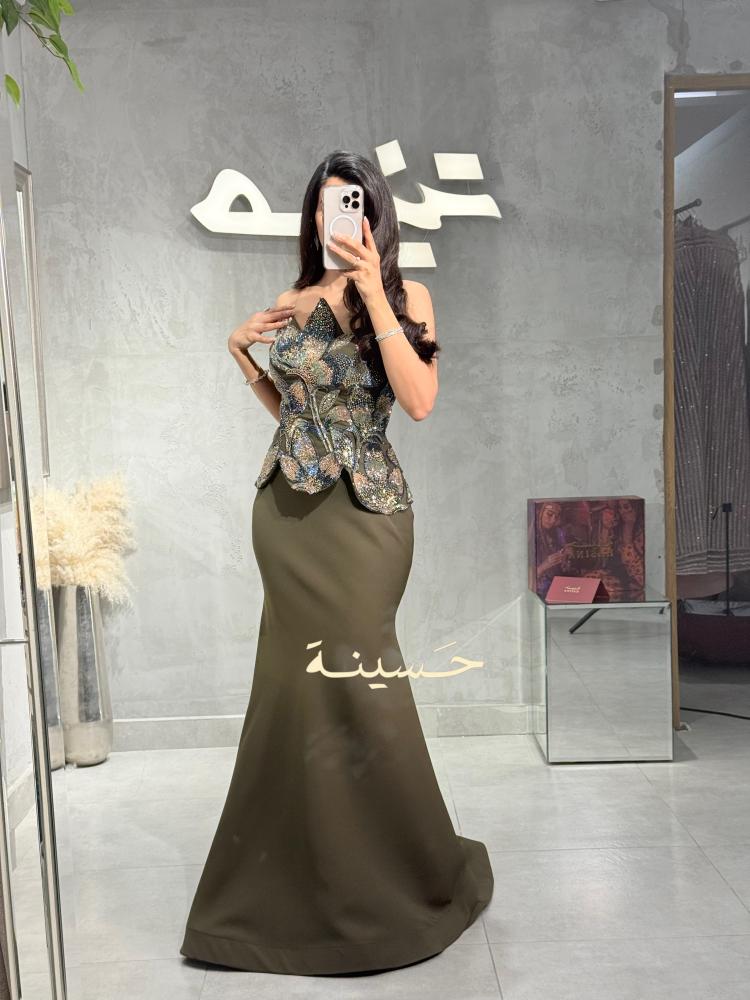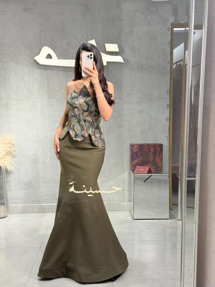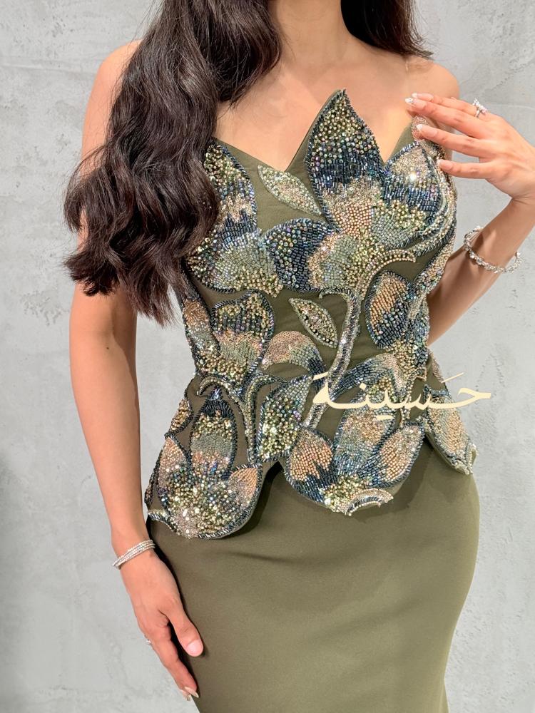فستان سهرة فخم بتصميم أنيق يجمع بين الفخامة والرقي، يتميّز بقصّة ضيّقة تبرز القوام بأسلوب أنثوي راقٍ، مع تنورة طويلة بقصّة مستقيمة تنساب بانسيابية حتى الأرض. الجزء العلوي مصمم بأسلوب استثنائي يشبه أوراق الزهور البارزة، مرصّع يدوياً بأحجار الكريستال اللامعة والخرز البراق بألوان متناغمة تضيف بُعداً ثلاثي الأبعاد ولمسة فنية ساحرة