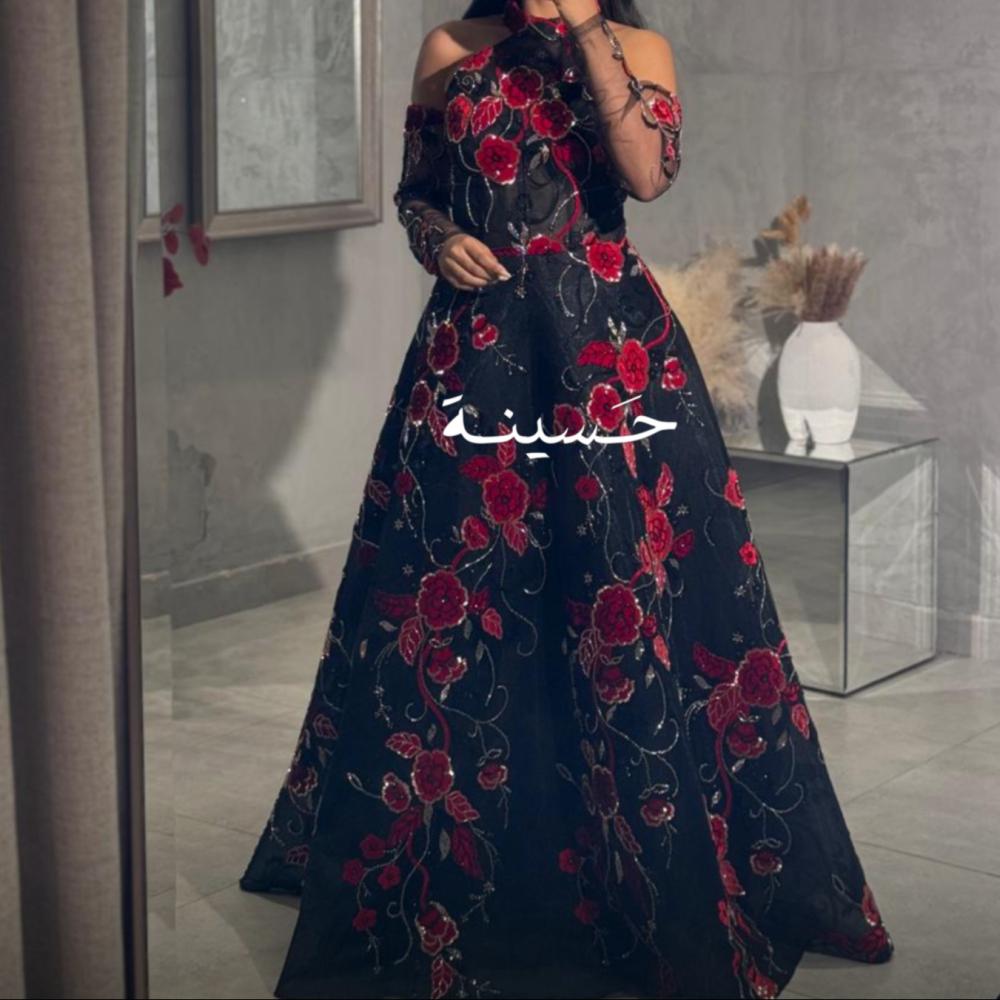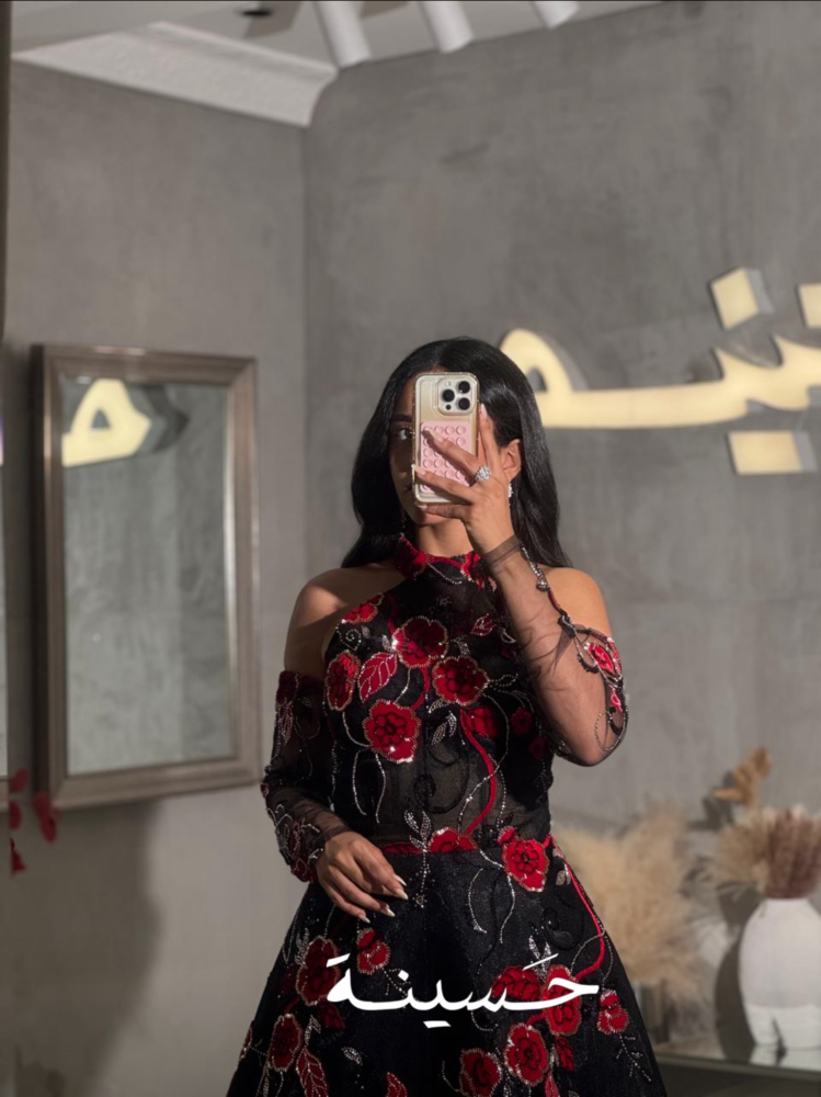 فستان فخم بأوف شولدر من التول الأسودفستان ملكي بخامة سميكة مطرزة بالورود الحمراء، مع كتف مكشوف وتفاصيل درامية تعطيك حضور مهيب وأنوثة لا توصف.