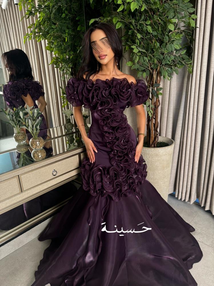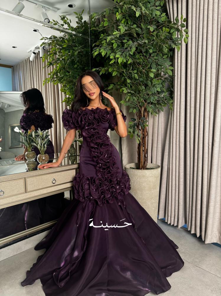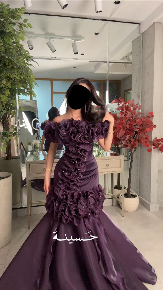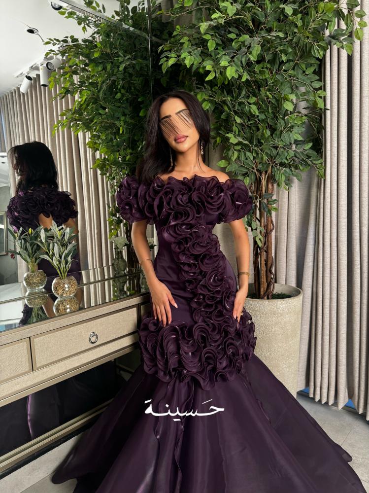 فستان بنفسجي داكن، مصمم بتفاصيل وردية ملفوفة من الصدر حتى الذيل، خامته فاخرة ووقفته ملكية تُلفت الأنظار.