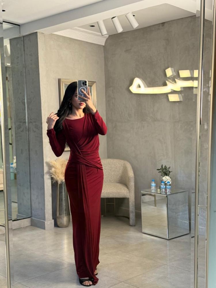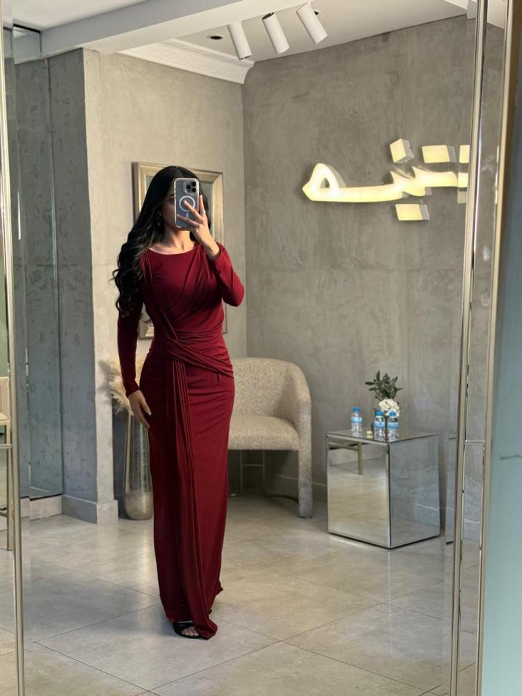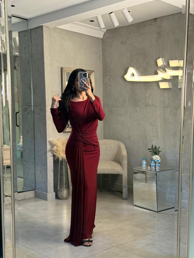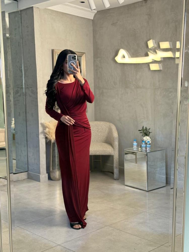 فستان سهرة أحمر ناعم بتكسيرات أنيقة من الأمامفستان عنّابي طويل بقصّة ضيّقة وانسيابية، مصنوع من قماش مطاطي ناعم، يتميّز بأكمام طويلة ودرابيه جانبي يبرز الخصر بشكل أنثوي أنيق. تصميم بسيط وراقي، مثالي للسهرات والمناسبات الرسمية.